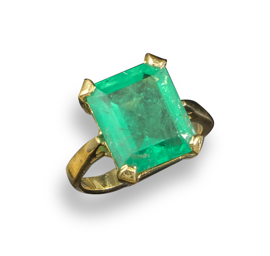 An emerald solitaire ring, the emerald-cut emerald is set in 18ct yellow gold, size Q