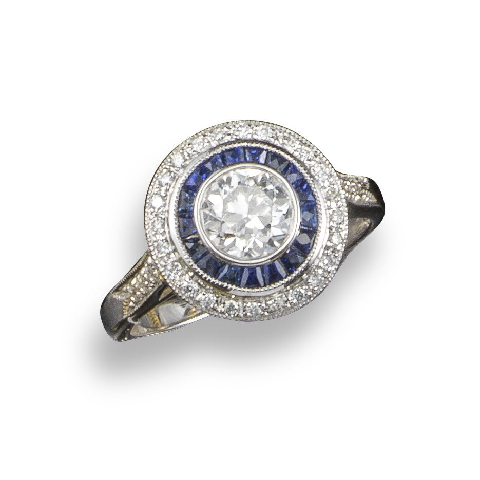 A sapphire and diamond target ring, the central old circular-cut diamond is set within calibre-cut sapphire and circular-cut diamond surround, with diamond-set shoulders in white gold, size N