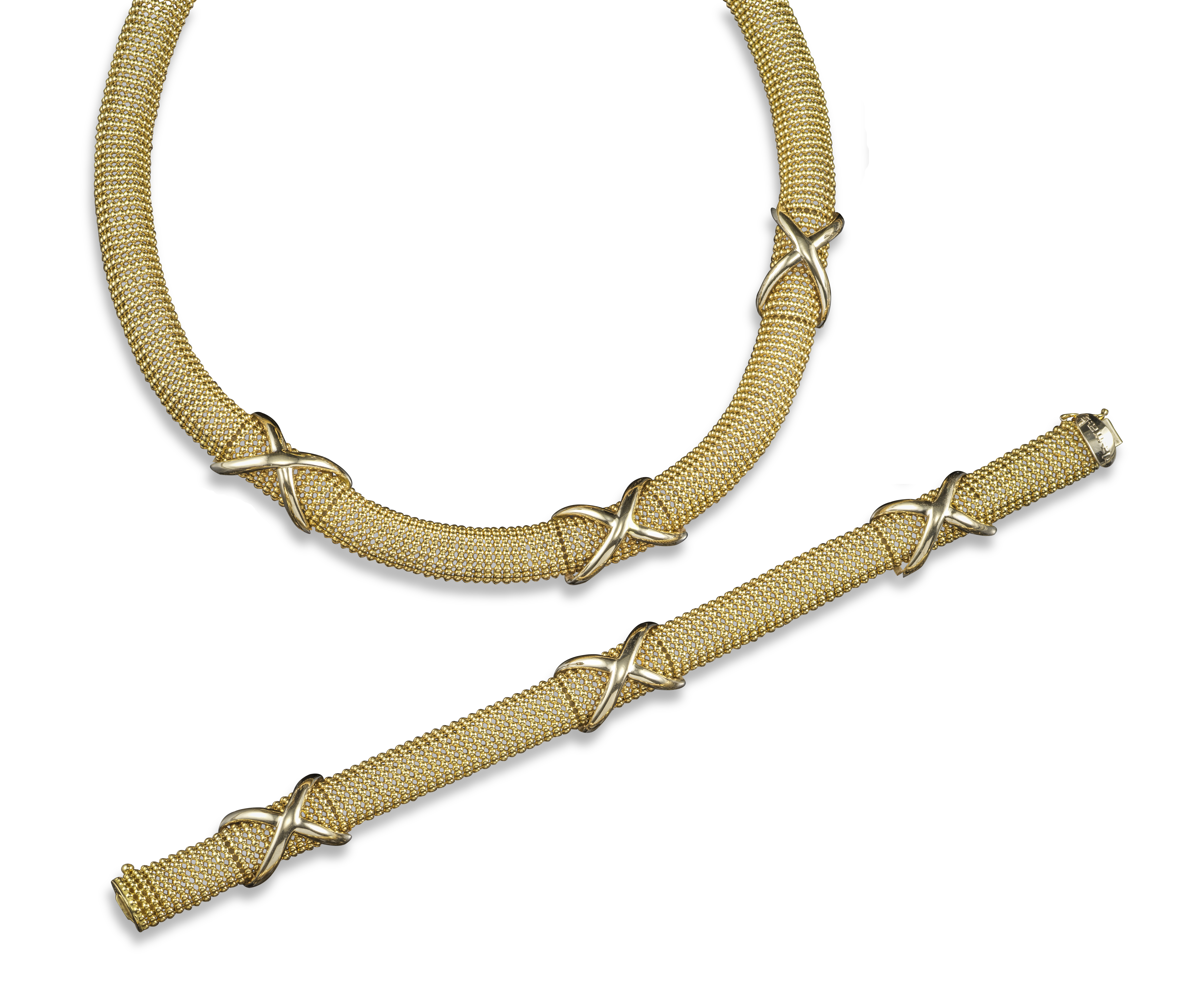A gold collar necklace, formed from conjoined gold spheres in concave form, applied with three gold 'X's in yellow gold, signed Damas to clasp, 46cm long, with a matching gold bracelet, 20.5cm long, 110g total