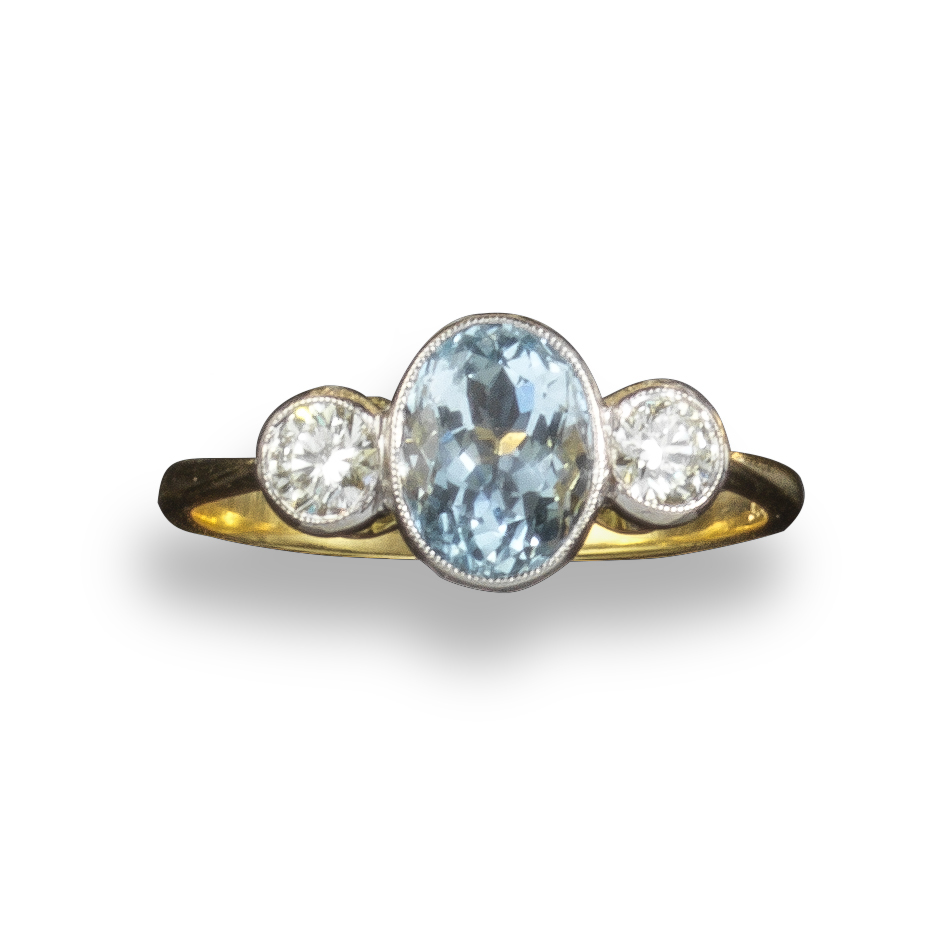 An aquamarine and diamond three-stone ring, the oval-shaped aquamarine set in yellow and white gold with round brilliant-cut shoulder diamonds, size P 1/2