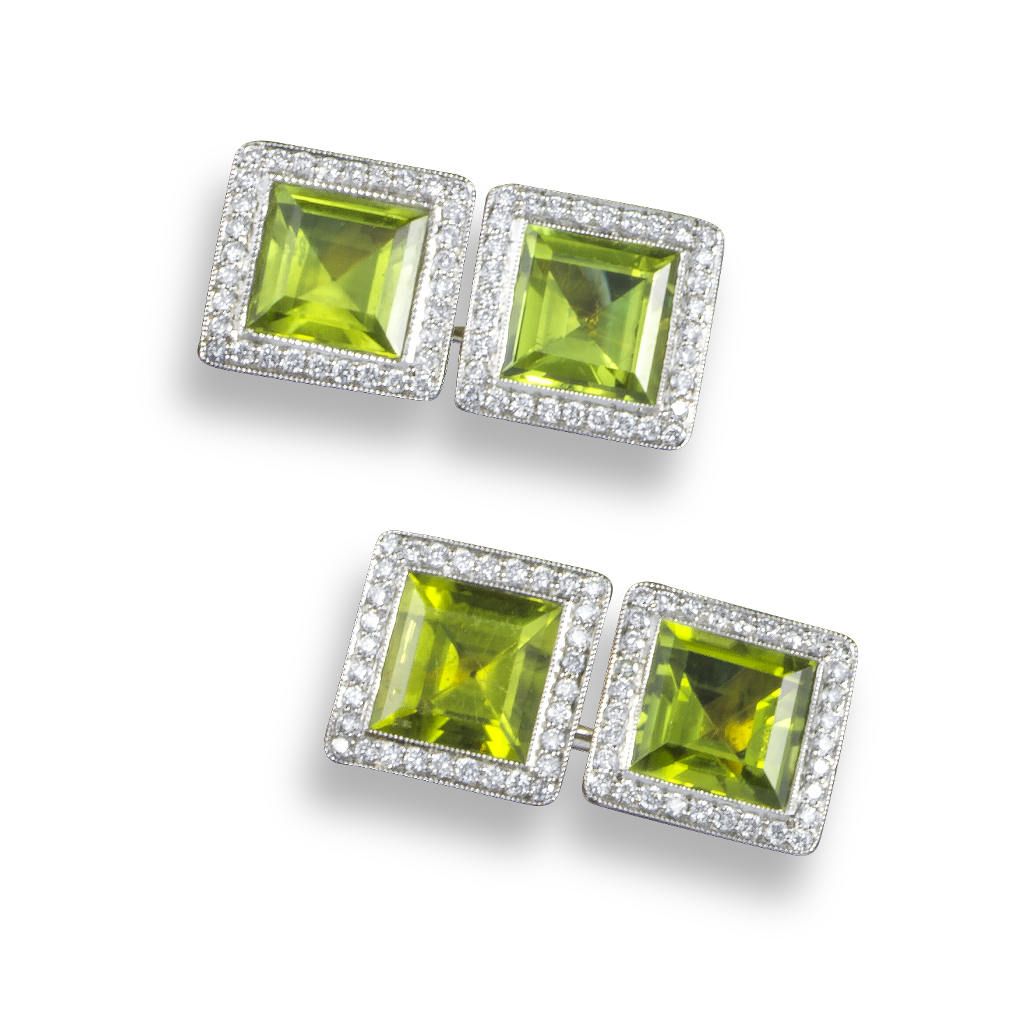 A pair of peridot and diamond cufflinks, each link set with a square-shaped peridot within a surround ciruclar-cut diamonds in platinum and yellow gold, each link 1.2cm wide
