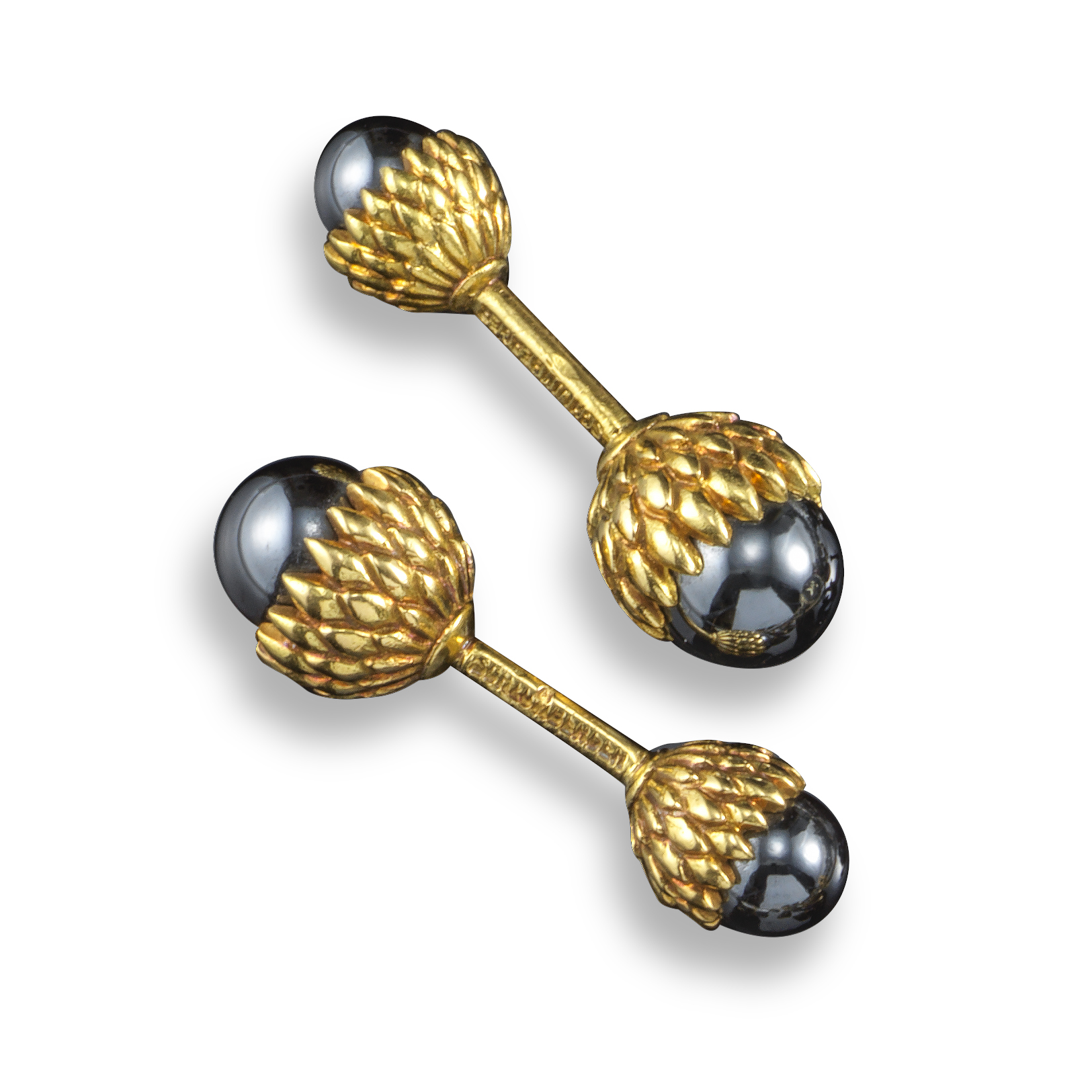 A pair of hematite and gold cufflinks by Schlumberger, the terminals each set with a spherical hematite within yellow gold mount designed as overlapping lozenges, signed Shlumberger with French marks and maker's lozenge