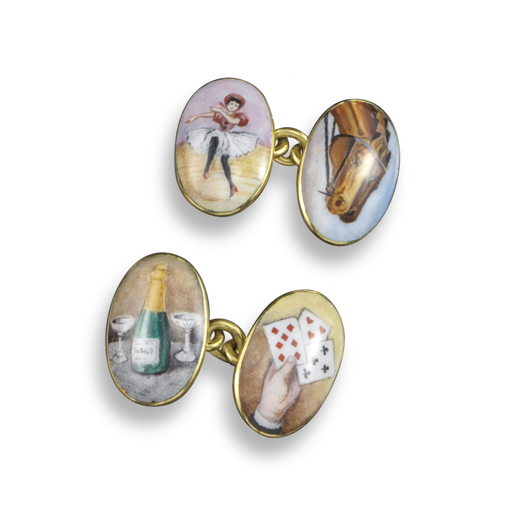 A pair of four vices cufflinks, the oval-links with enamel decoration in yellow gold