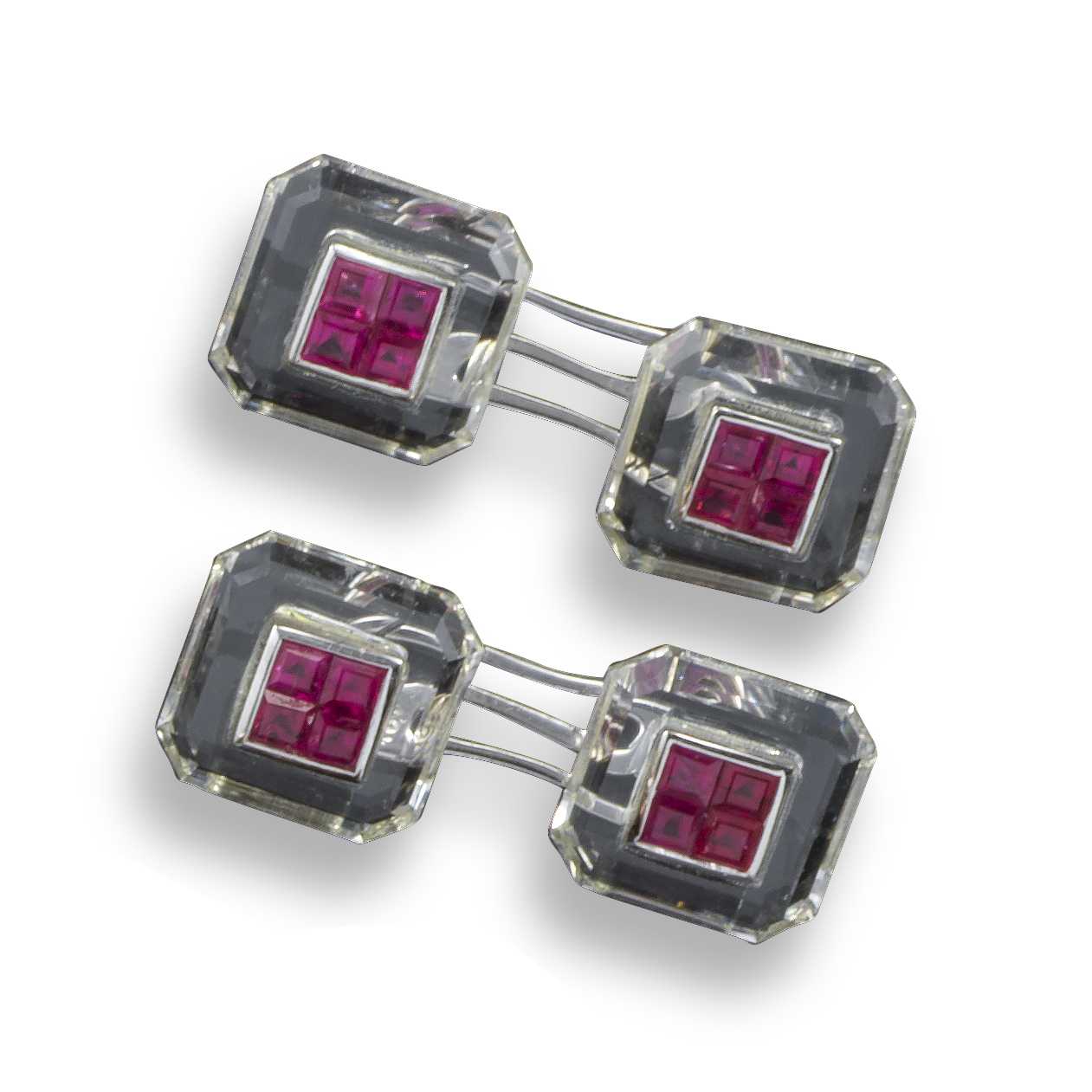 A pair of rock crystal and ruby cufflinks, each octagonal link set with four calibre-cut rubies in white gold