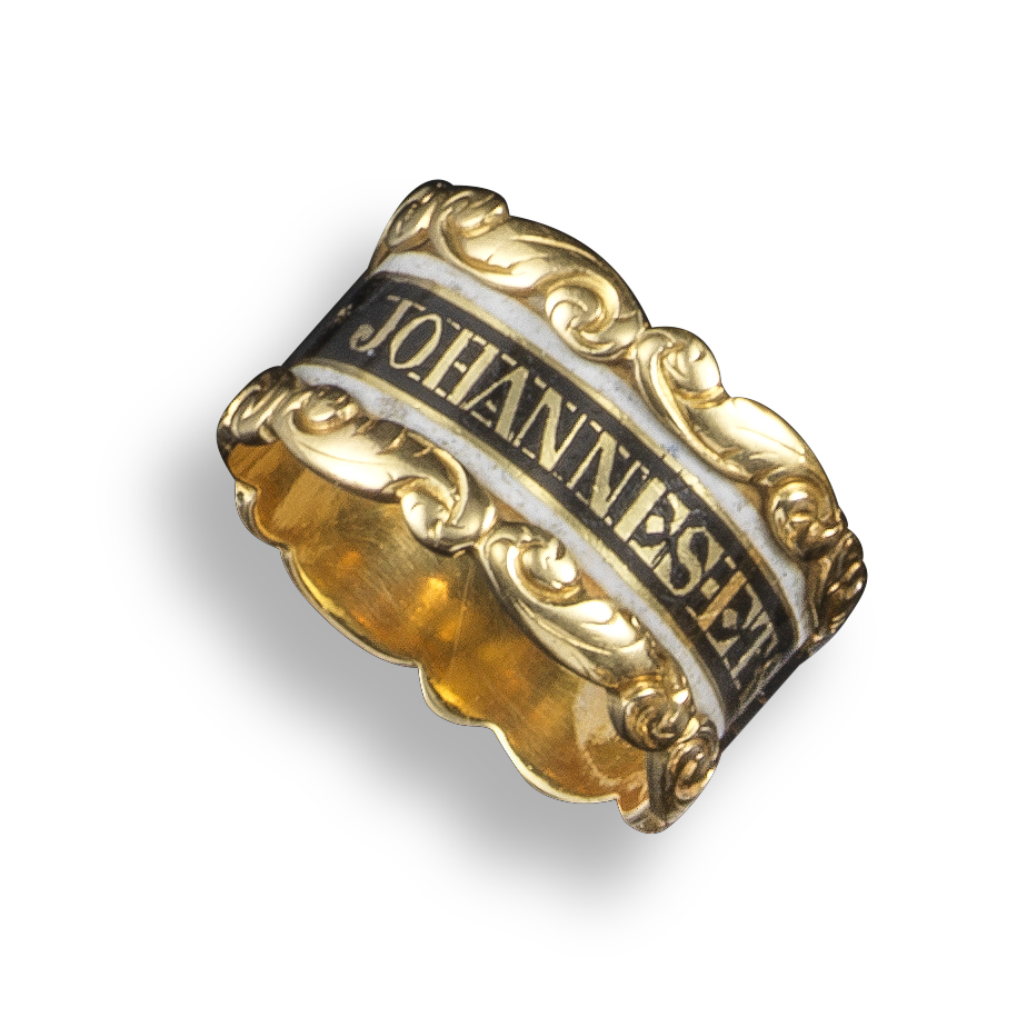 A Victorian gold mourning ring, centred with black enamel and gold inscription line within white enamel border and scrolling decoration to both rims, the centre section with 'Johannes et Sarah Prince', London marks for 1859 and partly obscured maker's mark, size J