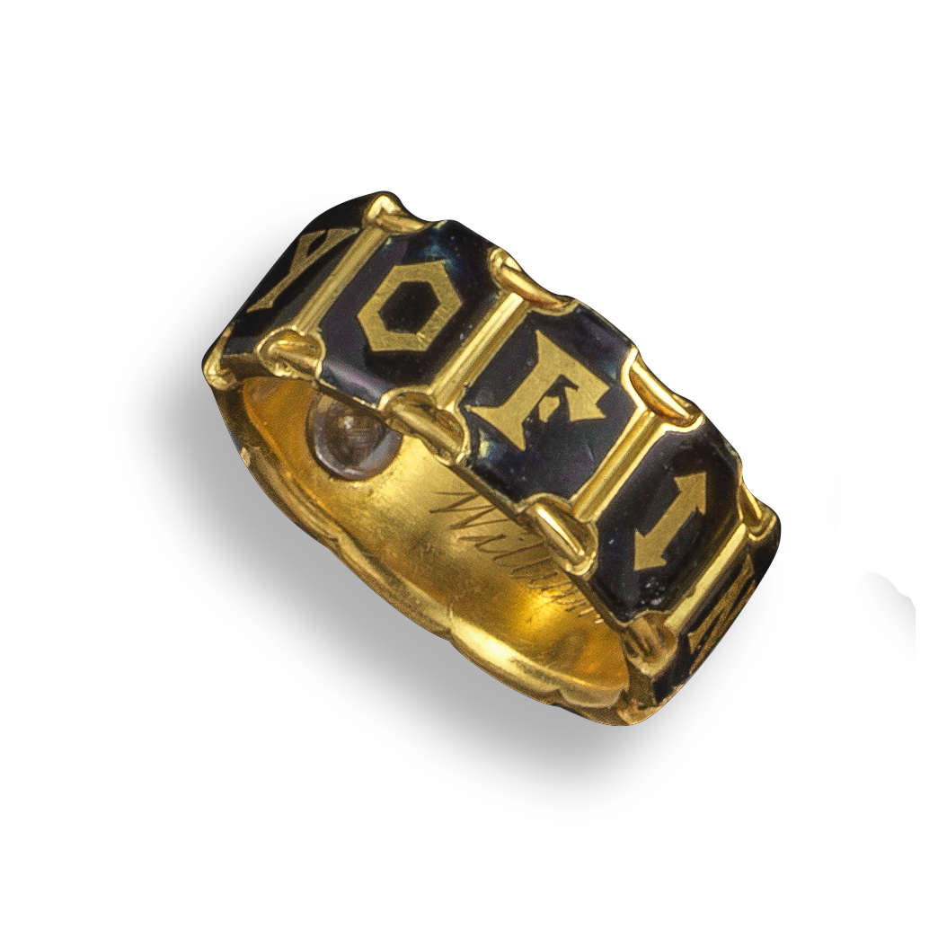 A mid 19th century gold and enamel mourning ring, decorated with black enamel panels and 'In Memory Of', the inner inscription reads 'William Escombe died October 23 1847', size M