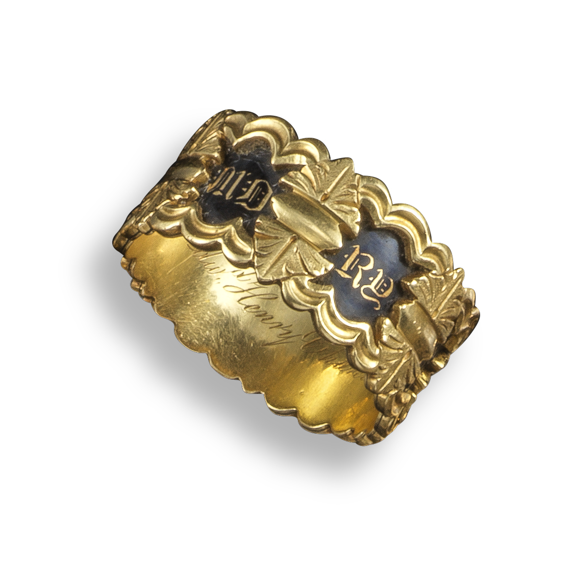 A mid 19th century gold mourning ring, the black enamel quatrefoil sections decorated with 'In Memory Of' within engraved gold borders, with inner inscription 'Mr Edwd Henry Chantler Obt 17th April 1836 Ae 61', with London hallmarks for 18ct, possibly 1843 but obscured, size S