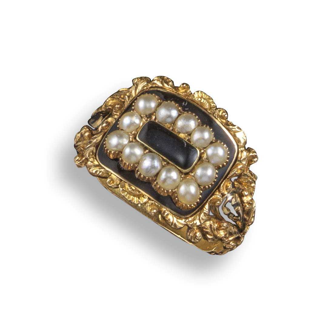 A George IV seed pearl and enamel gold mourning ring, the rectangular centre section set with seed pearls