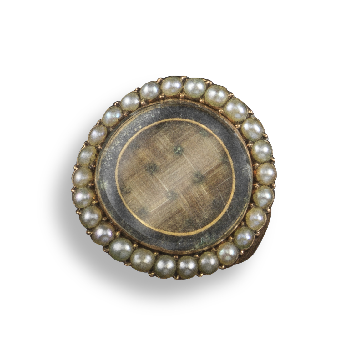 A late 18th century seed pearl and gold mourning ring, set with a central circular locket containing plaited hair within circular seed pearl border, with inner inscription 'Robert Wharrie ob 17 March 1793 Ae 48, size K approx.