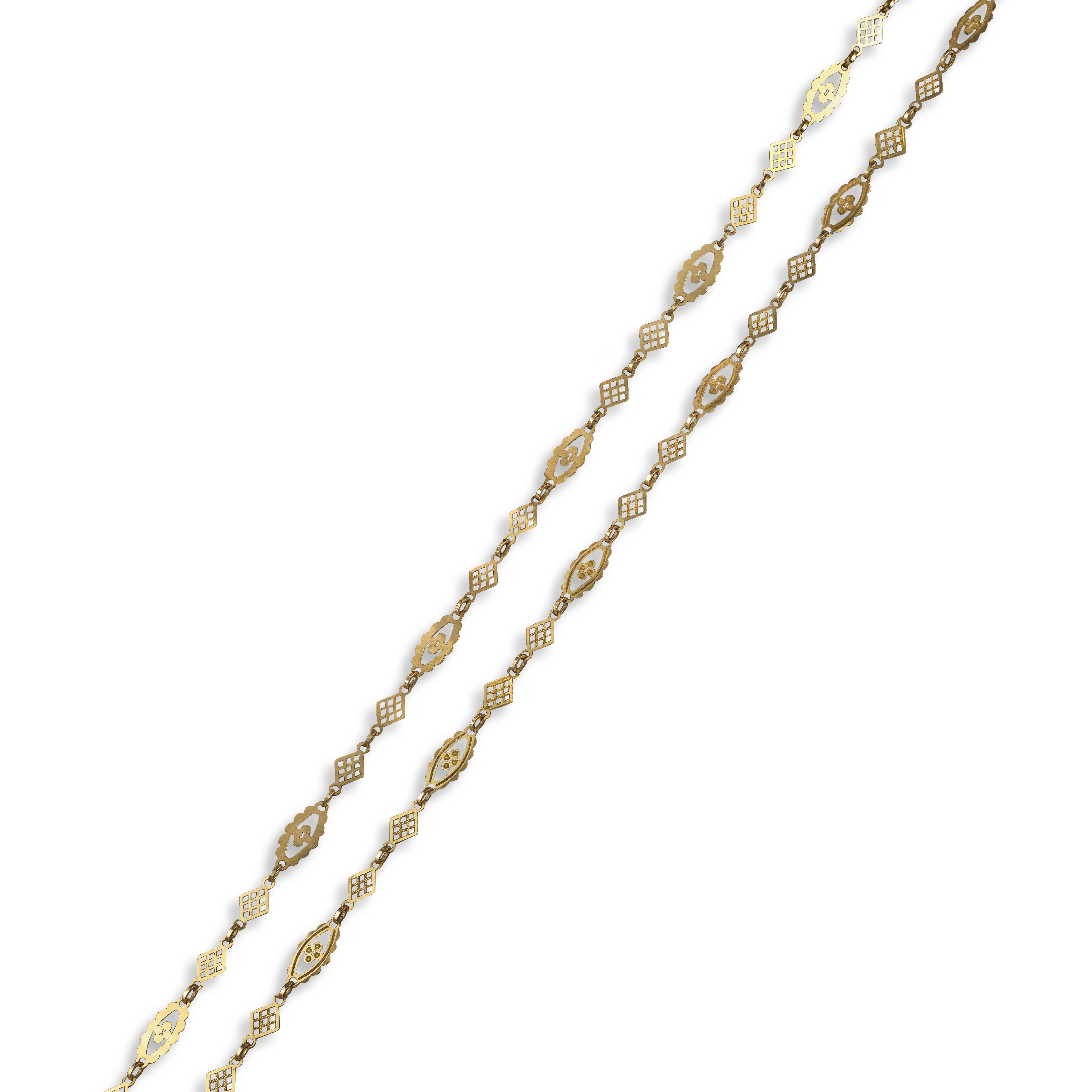 A Regency gold long guard chain, the fancy lozenge and rhombus-shaped links are pieces, with ropetwist decoration in gold, 15g, 108cm