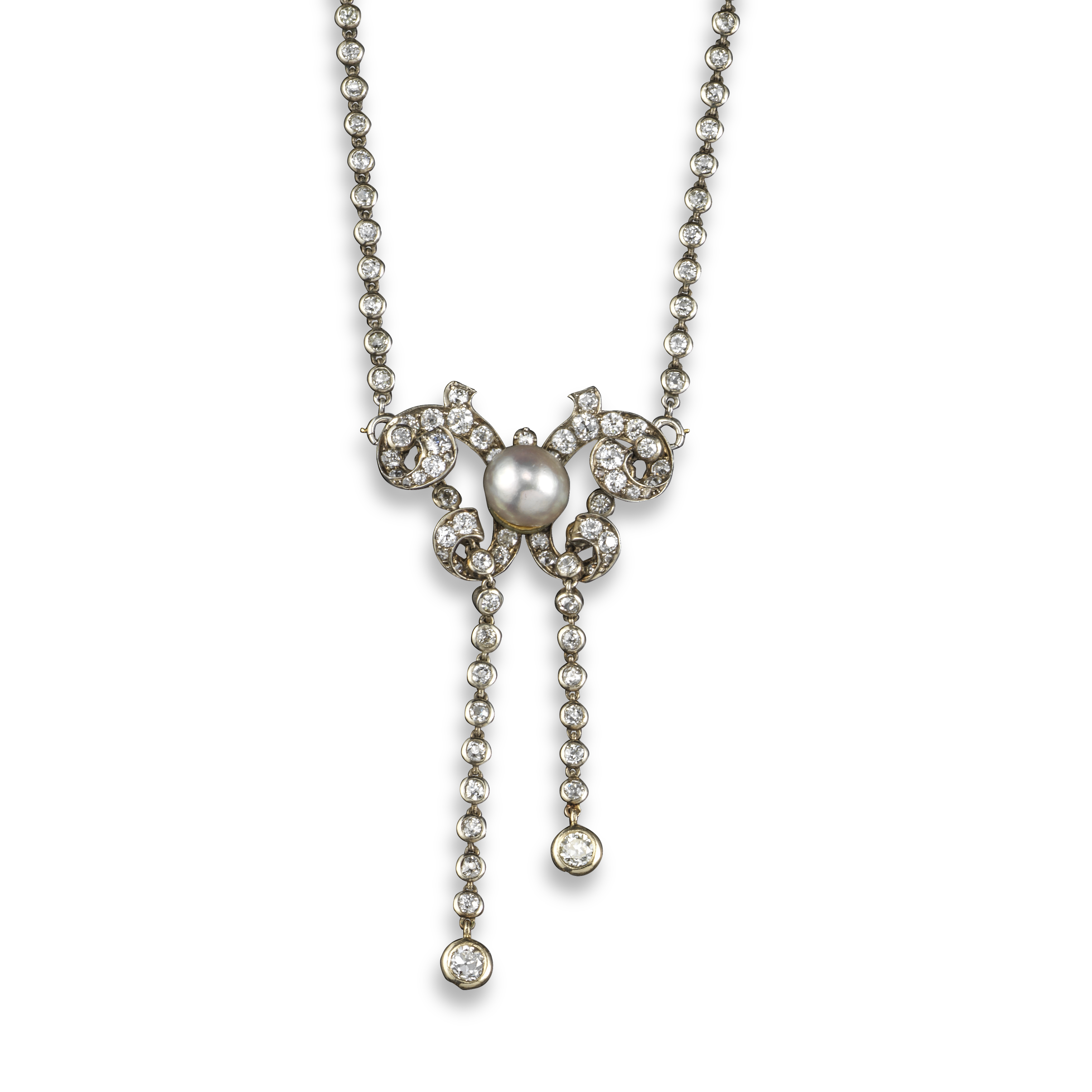 A late Victorian natural pearl and diamond pendant, on diamond necklace, the inverted scrolls set with graduated old circular-cut diamonds and centred with a natural pearl, suspending two articulated lines of graduated diamonds and with a detachable diamond-set necklace in silver and gold, necklace 40cm, fitted case by Hancocks containing a detachable brooch fitting in hidden compartment