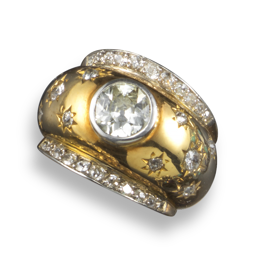 A diamond bombé ring, c1940, set with a central circular-cut diamond which weighs approximately 1.25cts, rubover-set in platinum and decorated with diamond shoulders and borders of graduated old circular-cut diamonds in yellow gold, size M