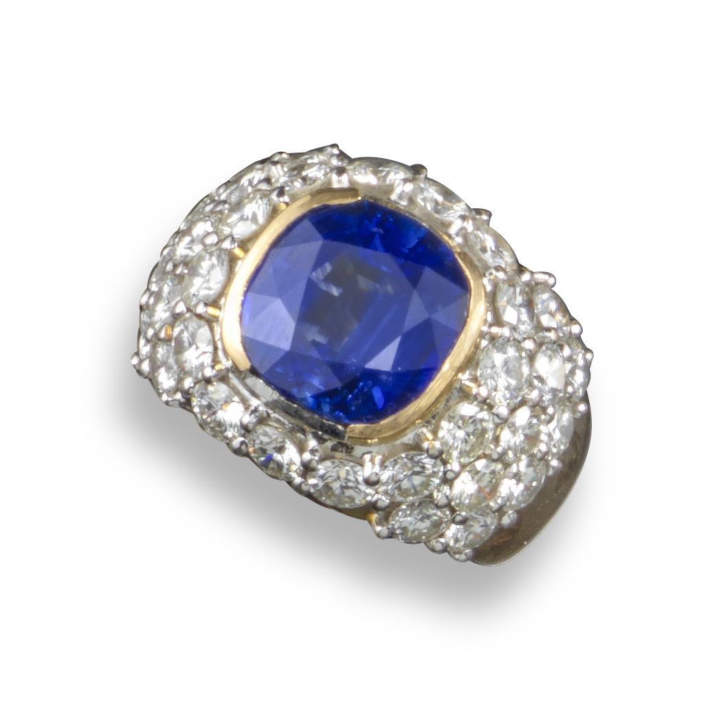 A sapphire and diamond-set cluster ring, the slightly cushion-shaped sapphire is pave-set in yellow gold and set with round brilliant-cut diamonds to the shoulders, size O