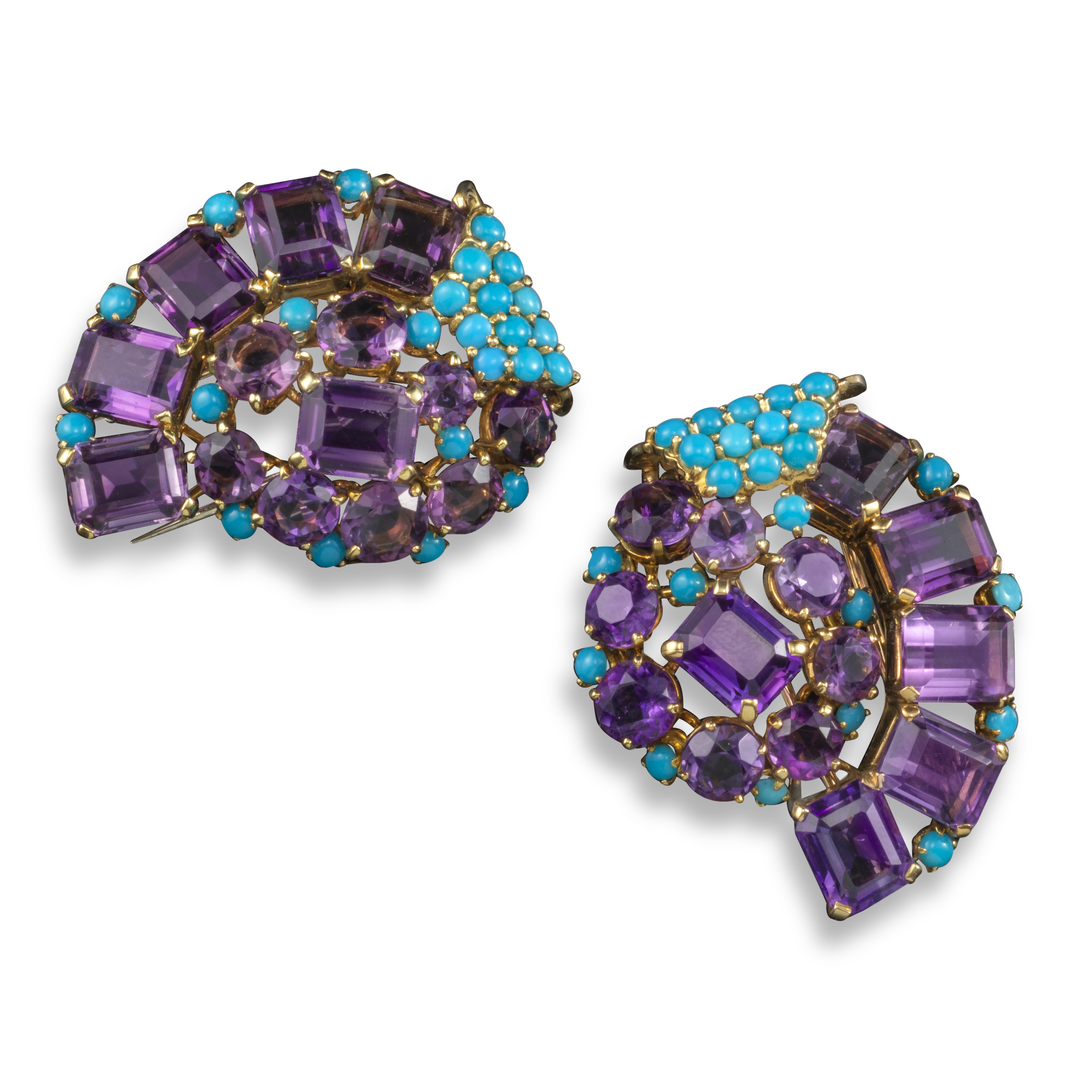 A pair of amethyst and turquoise double clips, c.1950, set with graduated emerald-cut and circular-cut amethysts and turquoise cabochons in yellow gold, 4.5cm wide
