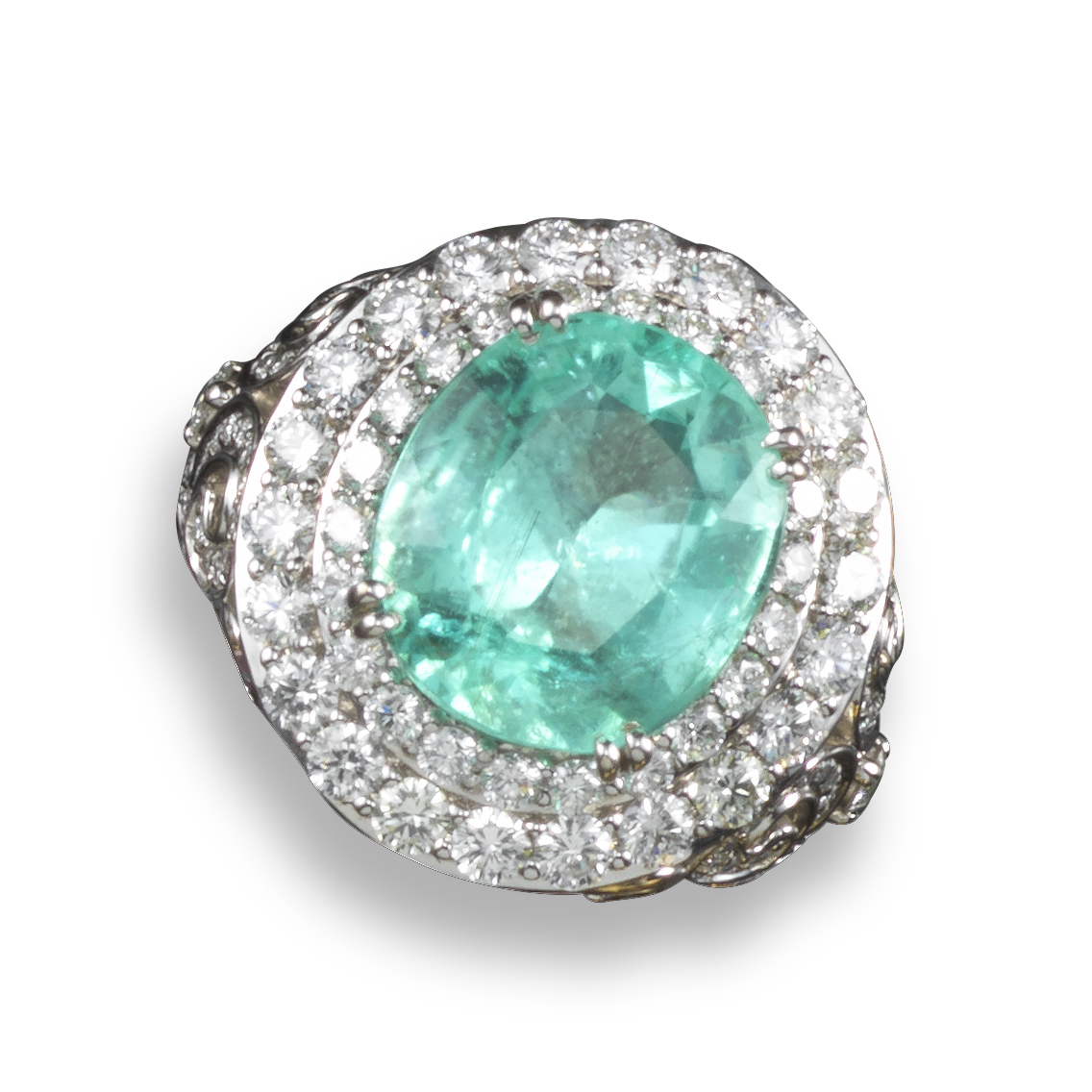 A Paraiba tourmaline and diamond ring, the oval-shaped tourmaline is set within a surround of graduated circular-cut diamonds in scrolling diamond-set white gold mount, size S