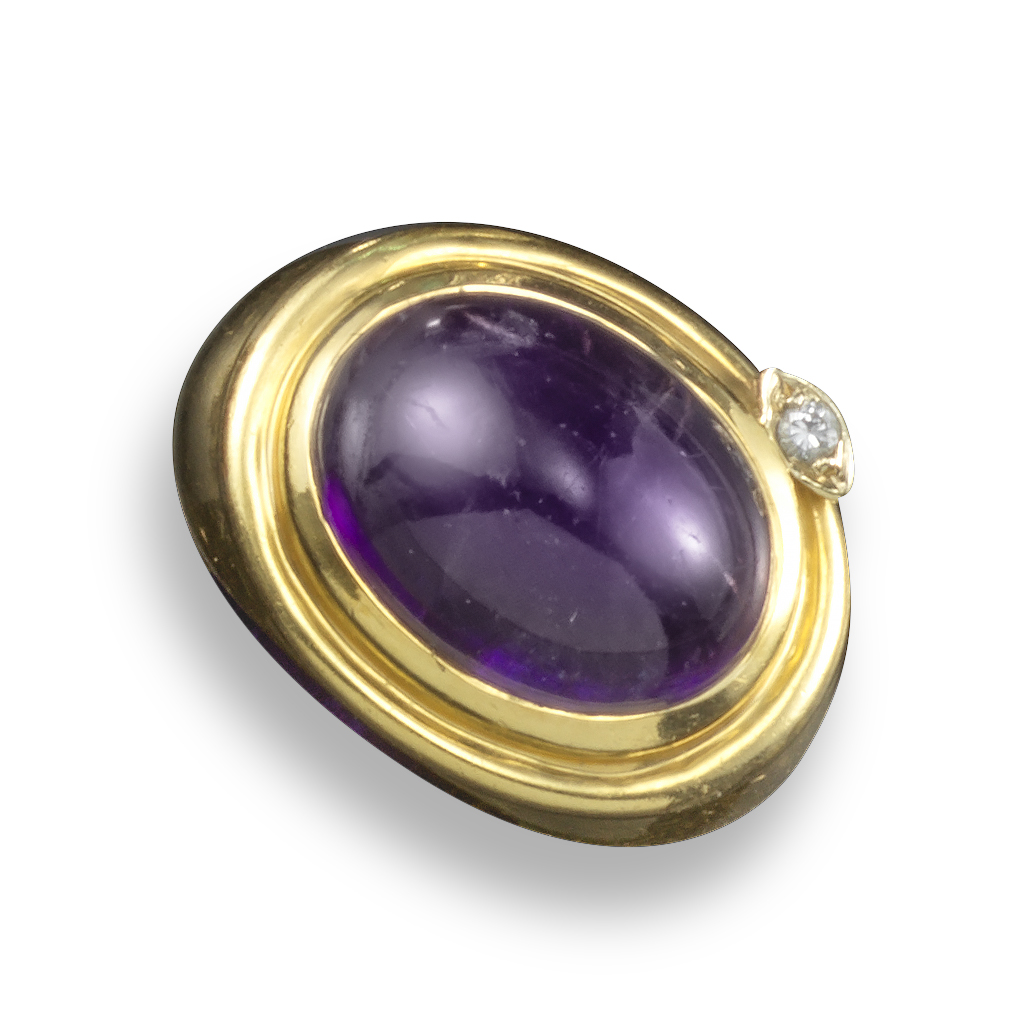 An amethyst and diamond gold ring, horizontally rubover-set with an amethyst cabochon and a circular-cut diamond in a tapered yellow gold mount, with inner resizing balls, size C approx.