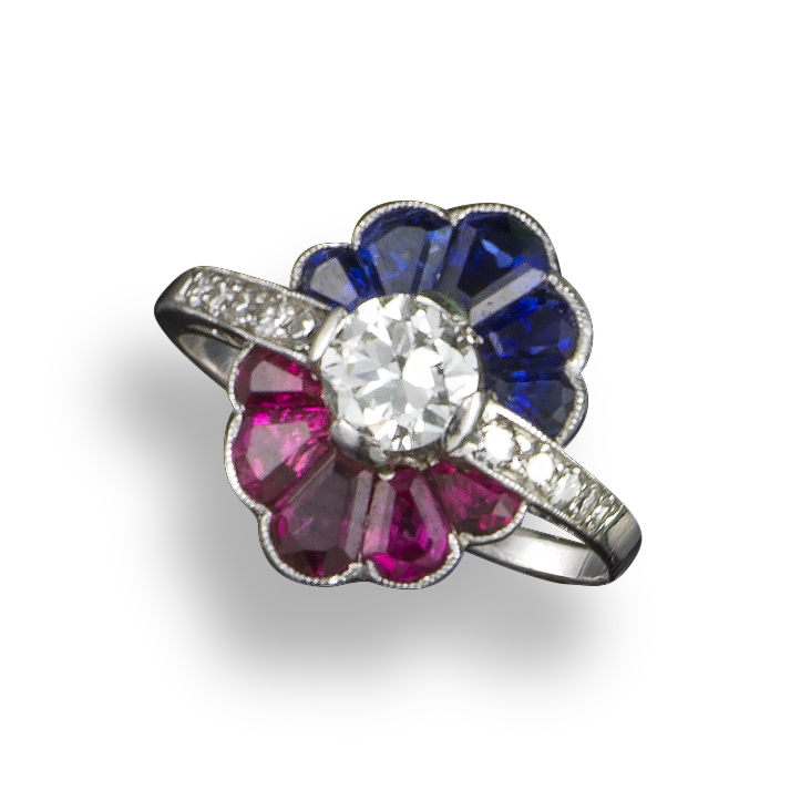 An Art Deco sapphire, diamond and ruby ring, centred with an old circular-cut diamond with five smaller circular-cut diamonds milegrain-set to each shoulder in platinum, to one side of the centre set with graduated fancy-shaped sapphires and rubies to the other, size O 1/2