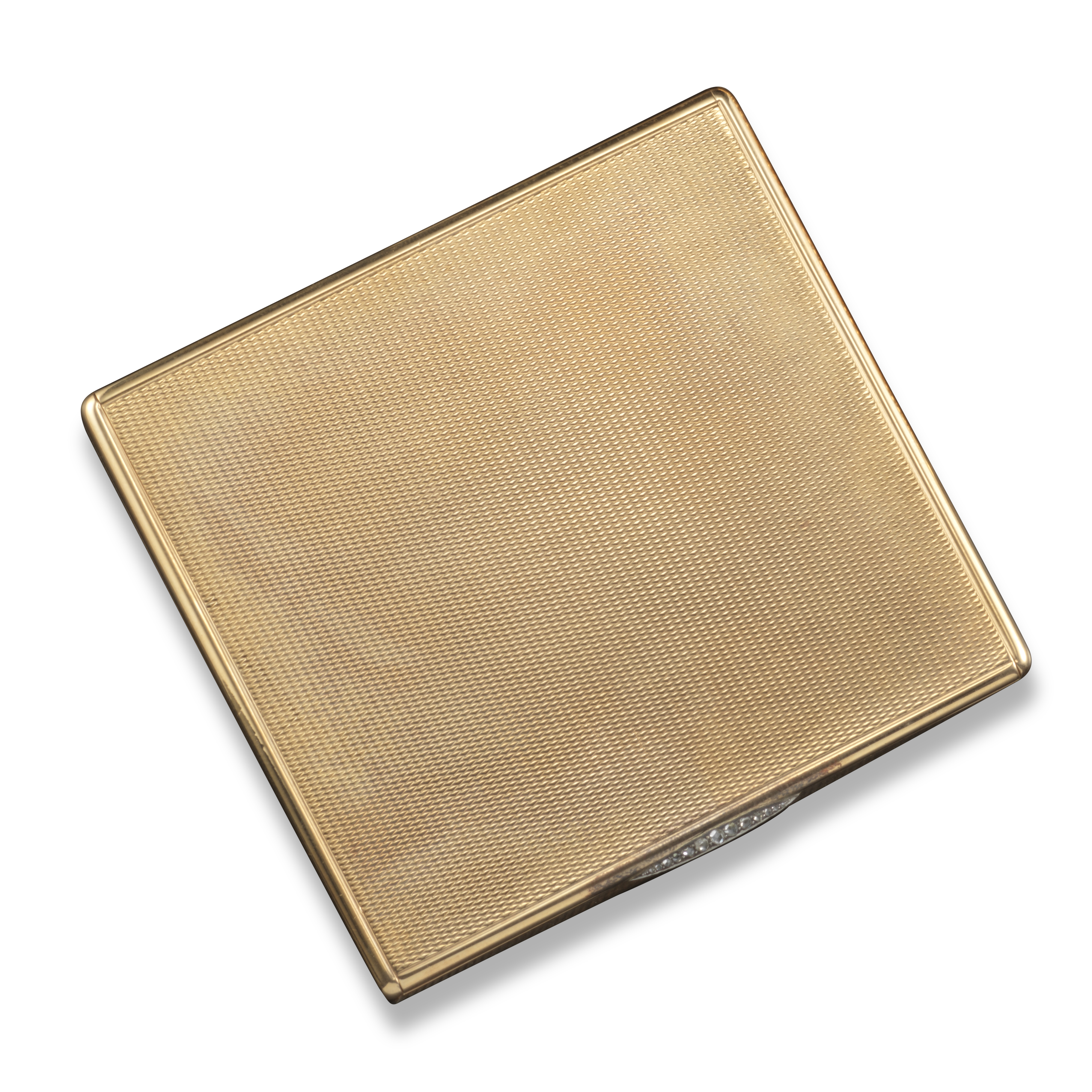 Fabergé - A rectangular gold box, workmaster Henrik Wigström, with engine-turned decoration and a diamond-set thumbpiece, signed Faberge to interior, 56 zolotnik and maker's mark for Henrik Wigström, 8cm wide, 111g, with outer leather pouch