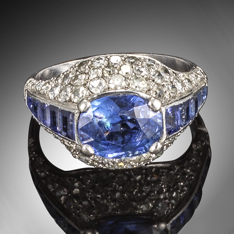 An early 20th century French sapphire and diamond-set ring, the oval-shaped sapphire is set with a line of five baguette-shaped sapphires to each shoulder and pavé-set with circular-cut diamonds in platinum, French control marks, size R