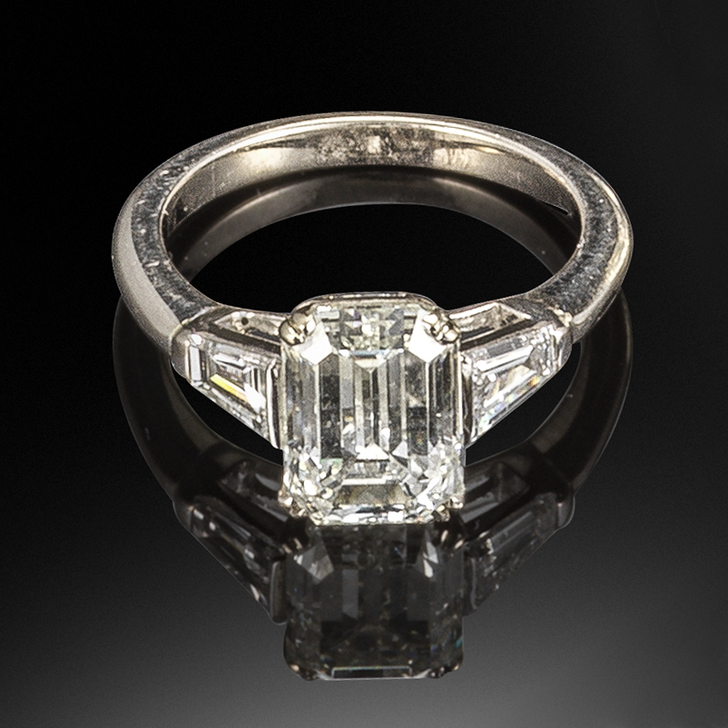 A French diamond three-stone ring, the emerald-cut diamond is set with tapered baguette-cut shoulder diamonds in white gold, French control marks, size K 1/2