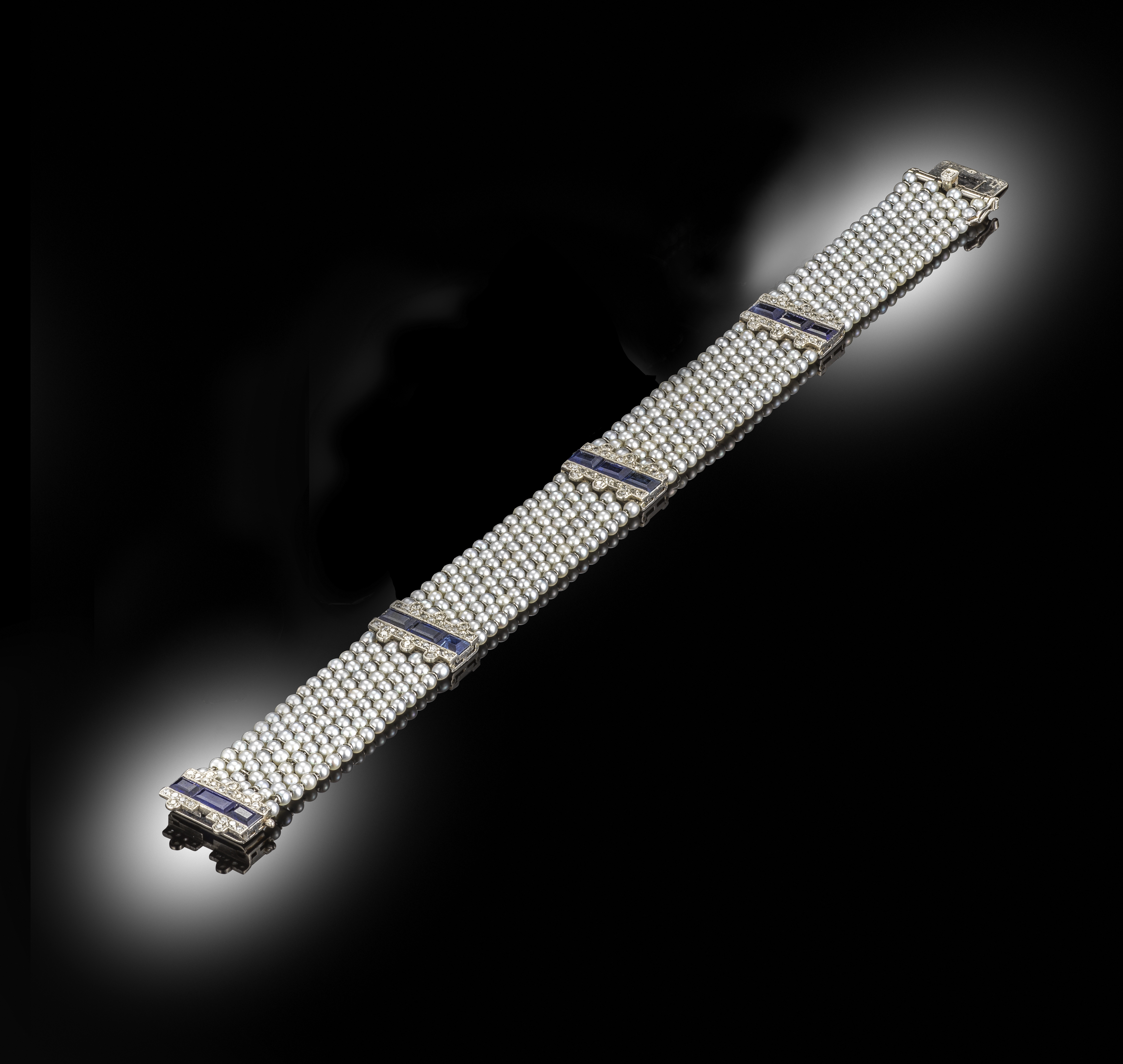A French Belle Époque pearl, sapphire and diamond bracelet, set with alternating rows of silver and cream pearls divided by calibre-cut sapphires and diamond-set rectangular links with demi-lune edges, millegrain-set in platinum, French control marks and maker's lozenge JD and remnants of a signature (possibly Cartier), 19.5cm long