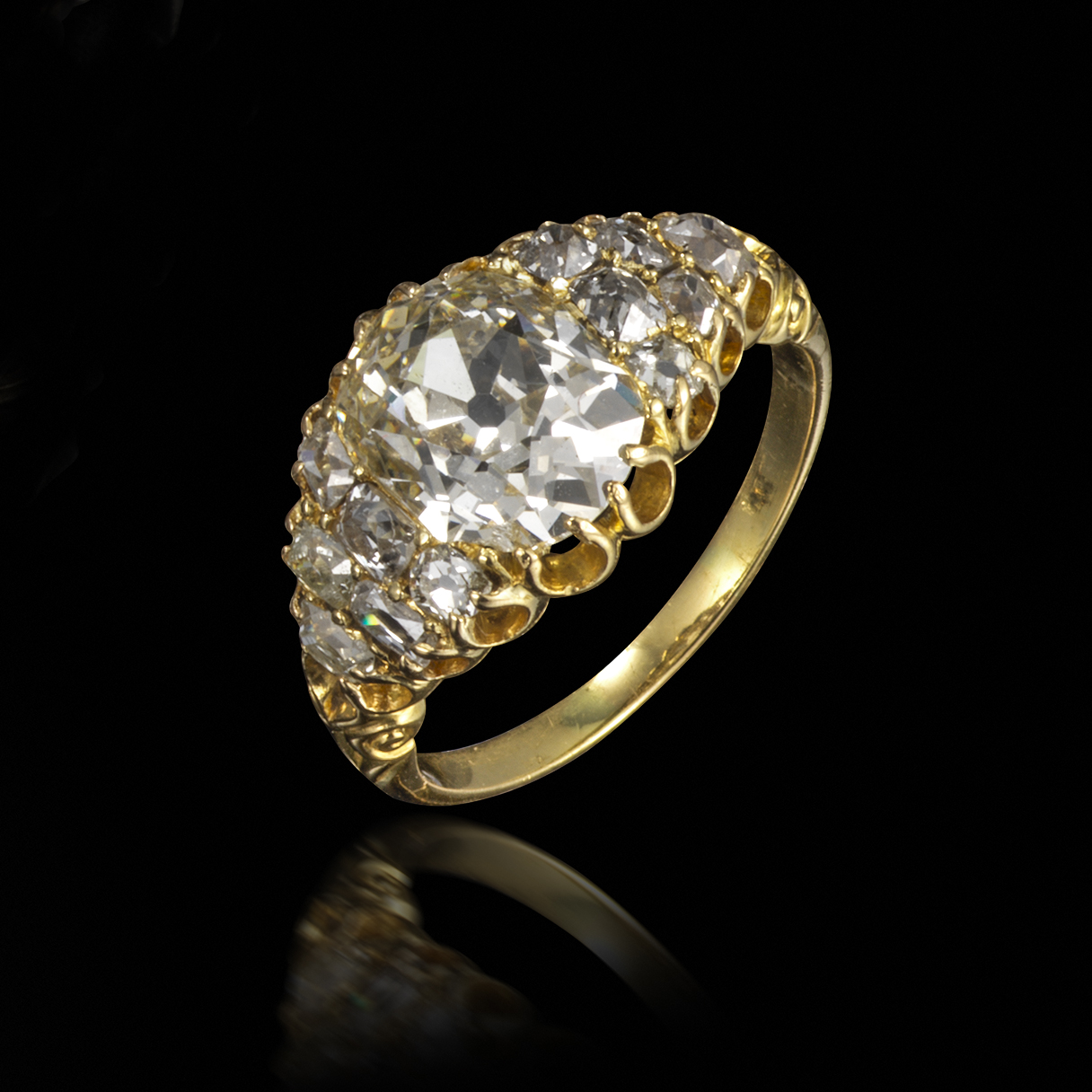 A Victorian diamond cluster ring, the central cushion-shaped diamond weighs 3.01cts and is flanked with graduated cushion-shaped diamonds in pierced yellow gold mount, size O