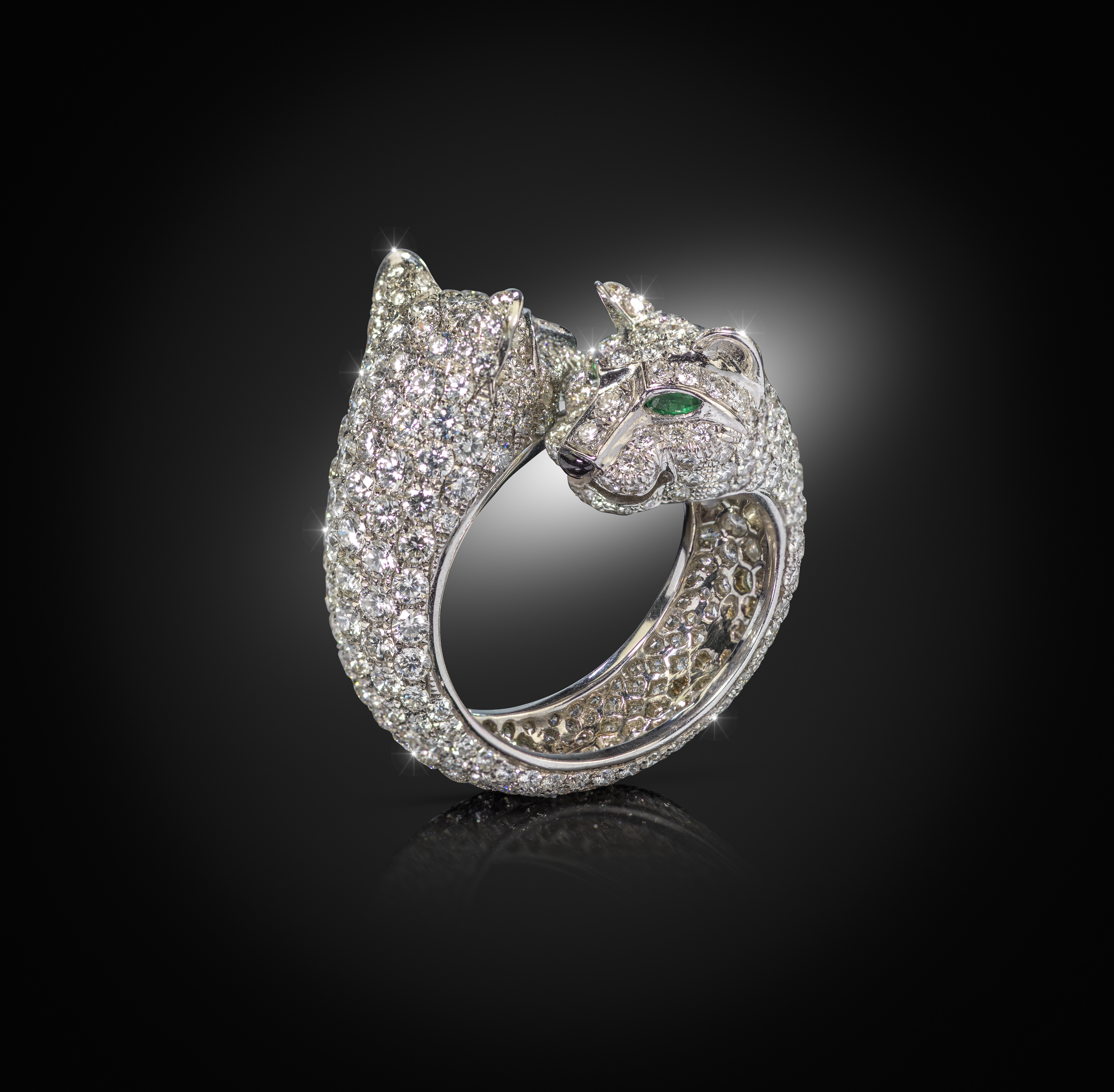 A diamond, emerald and onyx panther ring, the crossover ring designed as twin panther heads with pear-shaped emerald eyes and onyx nose, pavé-set overall with circular-cut diamonds, size O 1/2