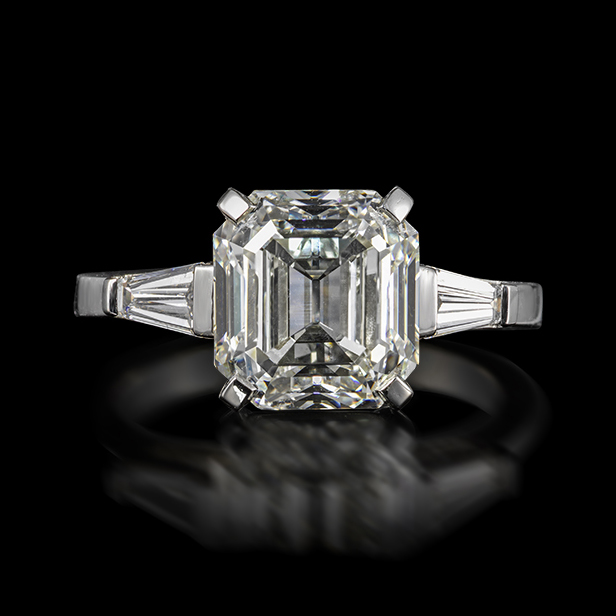 A diamond solitaire ring, the Asscher-cut diamond weighs 4.04cts, flanked with tapered baguette-shaped diamond shoulders in platinum, size L 1/2