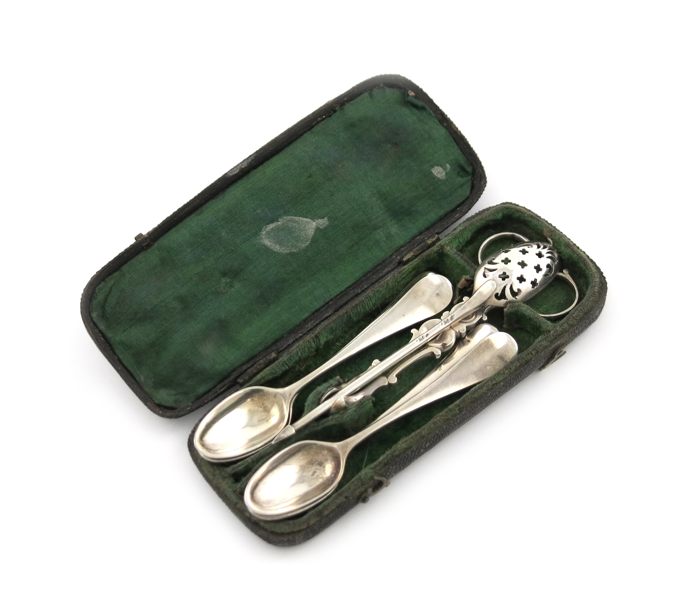 the mote spoon with a pierced bowl, the nips with ring handles, the spoons of Hanoverian pattern, in a fitted shagreen case, length of mote spoon 9.3cm, approx. weight 1.5oz. (6)
