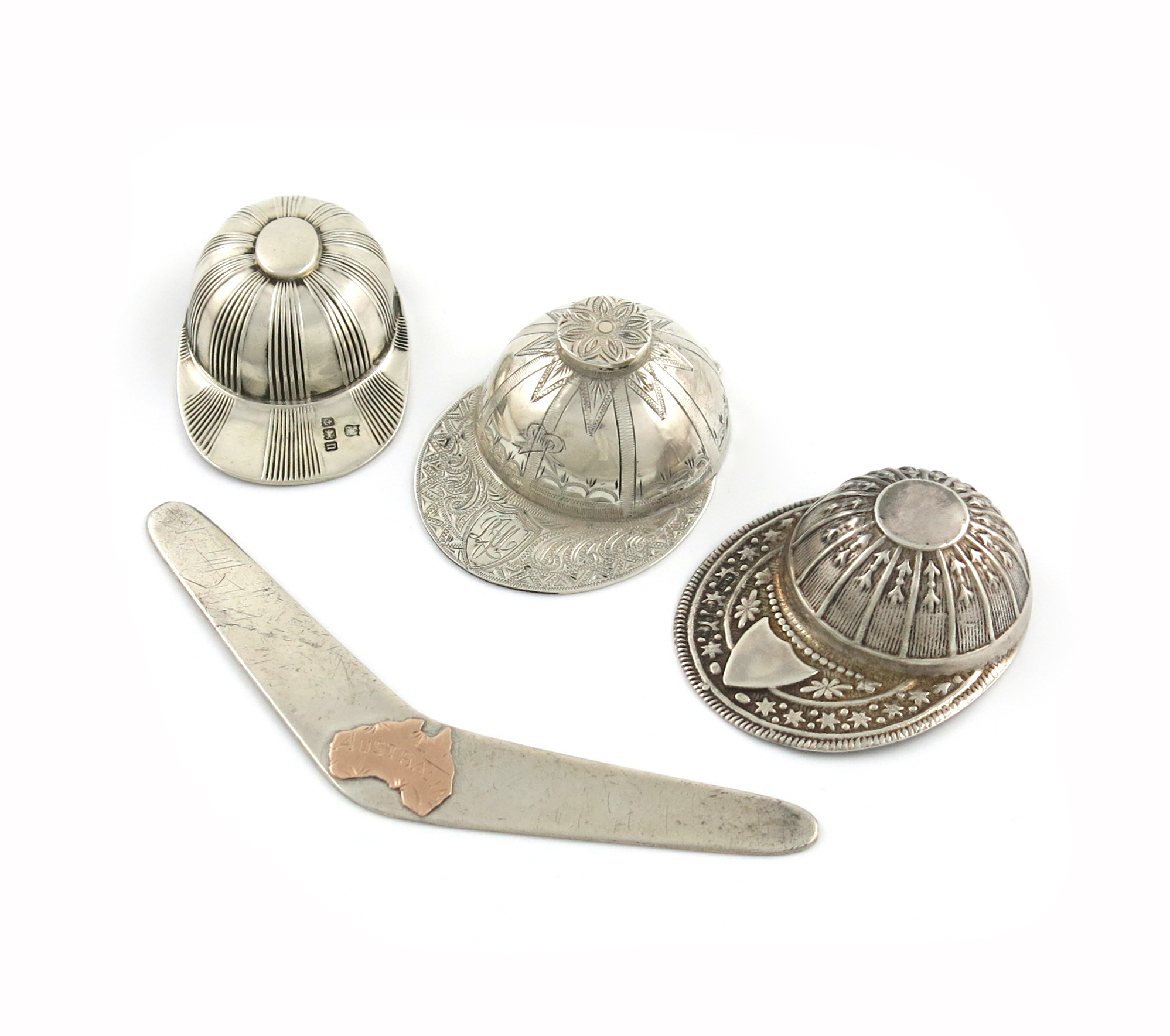 comprising: an Australian one by Davis and Son, Adelaide, a Victorian one by Hilliard and Thomason, Birmingham 1890, plus one William Neale Limited, Birmingham 1912, plus an Australian letter knife, modelled as a boomerang, by Proud, the centre applied with a map of Australia, length 11cm, approx. weight 1.7oz. (4)