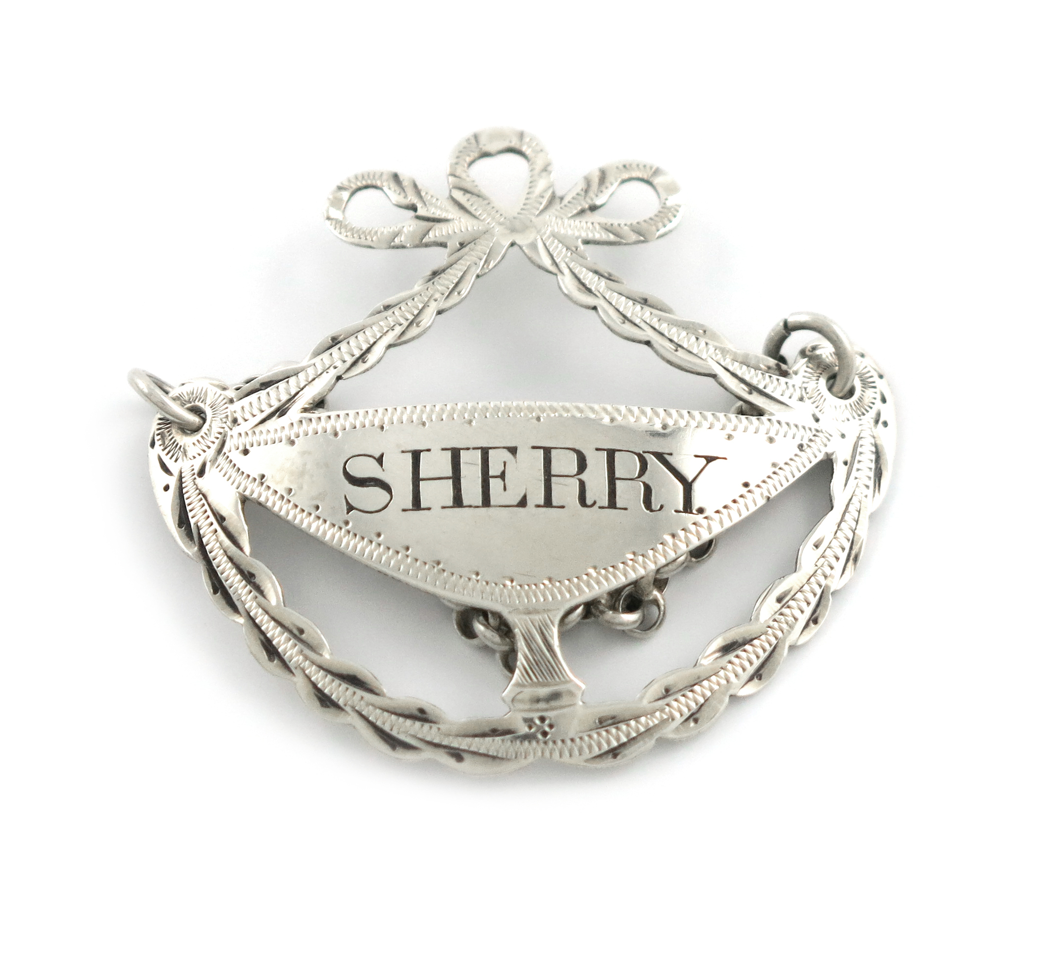 goblet form, with pierced ribbon-tied festooned borders, bright-cut decoration, incised 'SHERRY', length 4.6cm, approx. weight 0.2oz.
