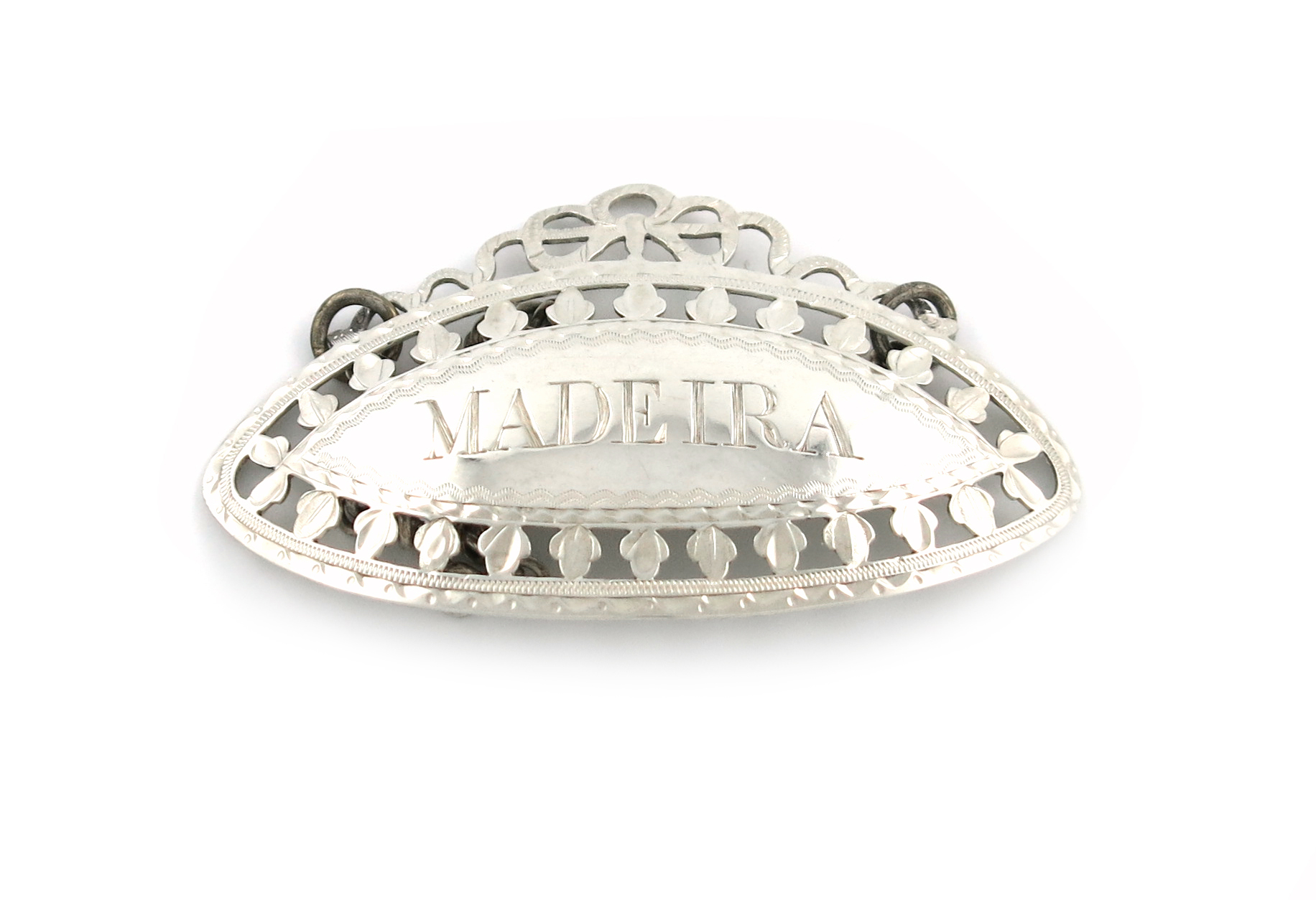 oval form, pierced and bright-cut decoration, ribbon-tied pediment, incised 'MADEIRA', length 6.8cm, approx. weight 0.4oz.