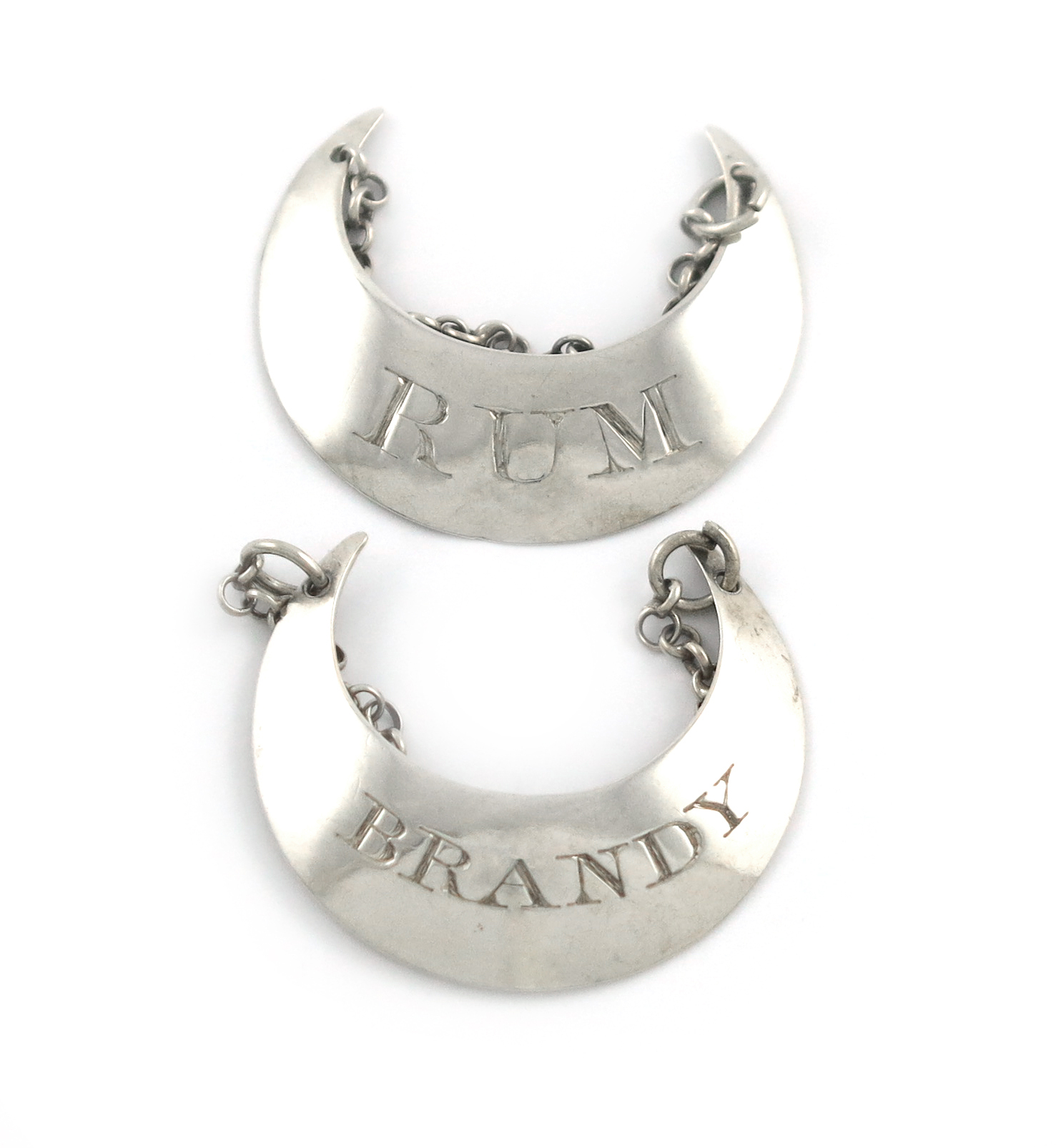 plain crescent form, incised 'RUM' and 'BRANDY', length 4.3cm, approx. weight 0.5oz. (2)