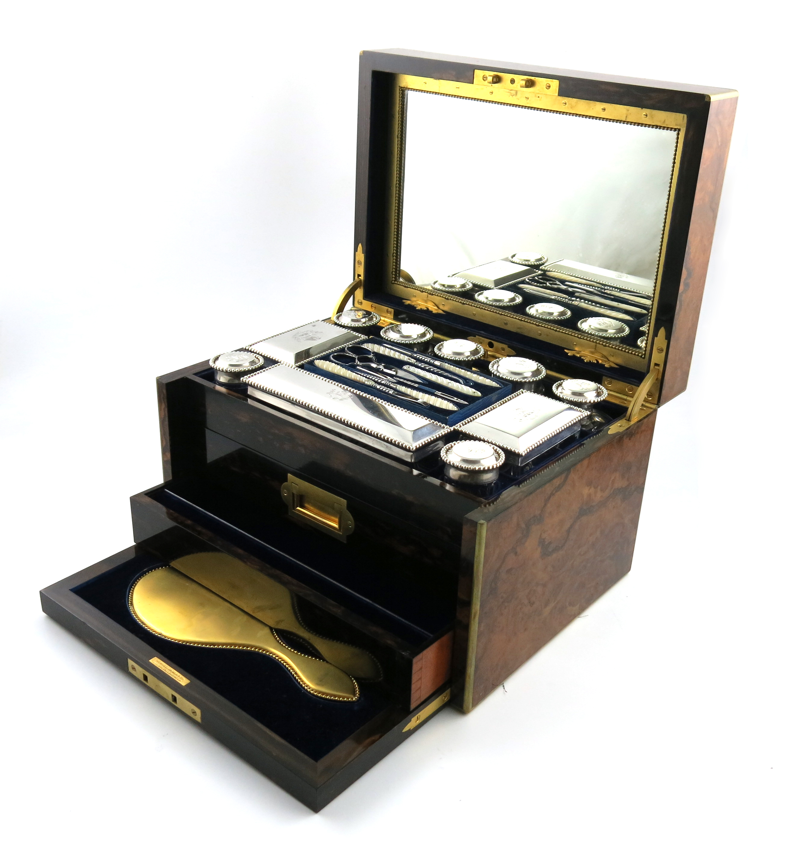 the plain covers with a heavy bead border and with a crest and motto, glass bodies, comprising: three scent bottles, four toilet jars, and three toilet boxes, with an eight-piece steel and mother-of-pearl manicure and sewing set, in a fitted walnut case, with brass banding, the interior of the cover with a gilt-mounted removable mirror and a stationary wallet, the hinged drop down front with an unmarked silver-gilt hand mirror with a beaded border, a pull-out drawer, and a secret jewellery drawer, length 33.7cm, height 21.5cm, approx. weighable 16oz.