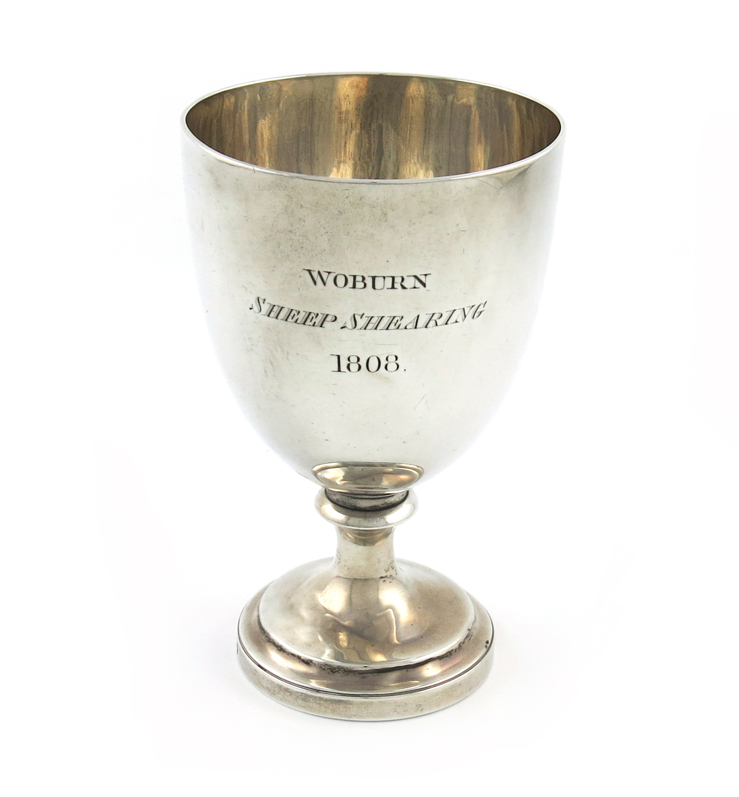 plain urn form, inscribed 'WOBURN SHEEP SHEARING 1808', the reverse later inscribed 'For the best Boar not exceeding two years old', height 15.8cm, approx. weight 8.9oz.