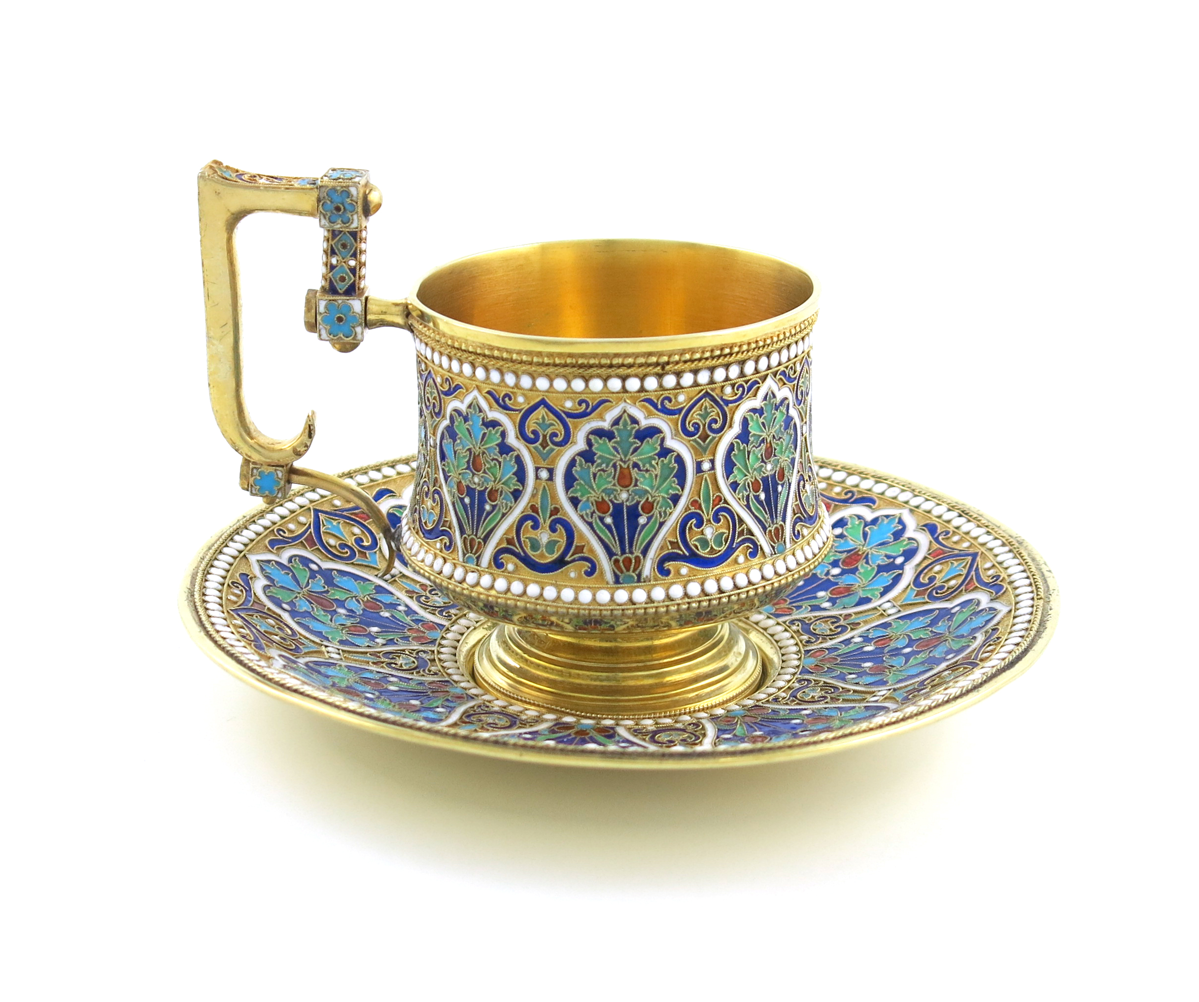 A late 19th century Russian silver-gilt and enamel cup and saucer