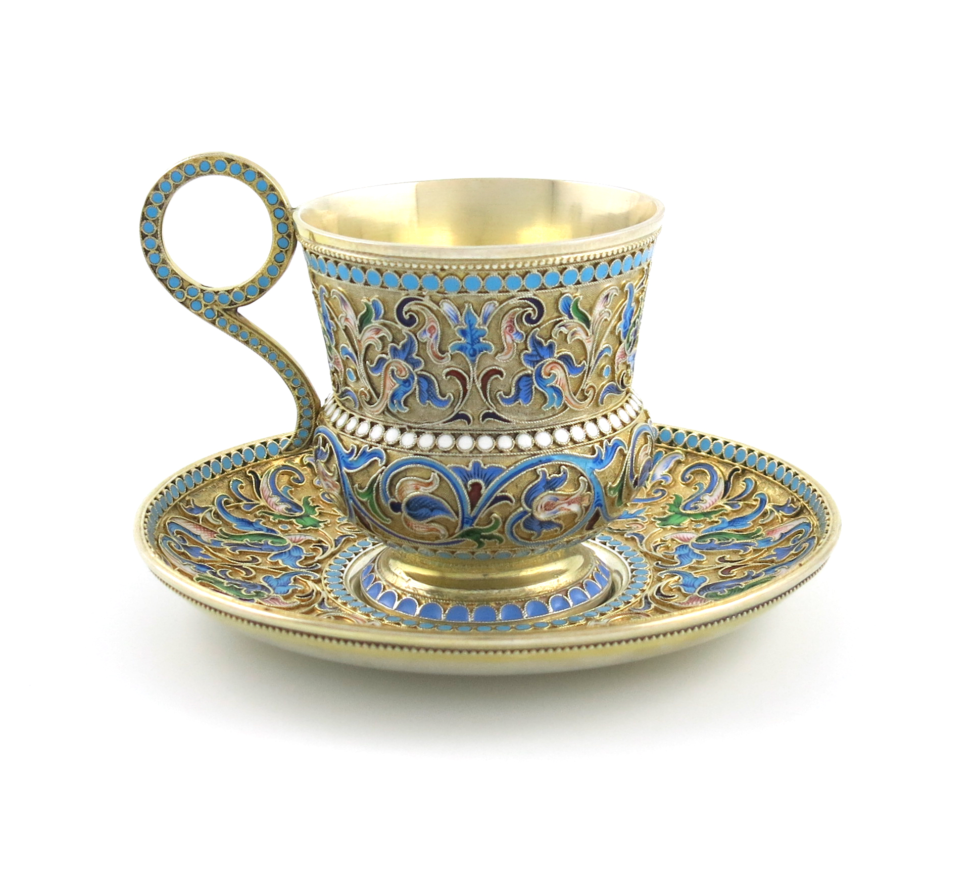 A late 19th century Russian silver-gilt and enamel cup and saucer