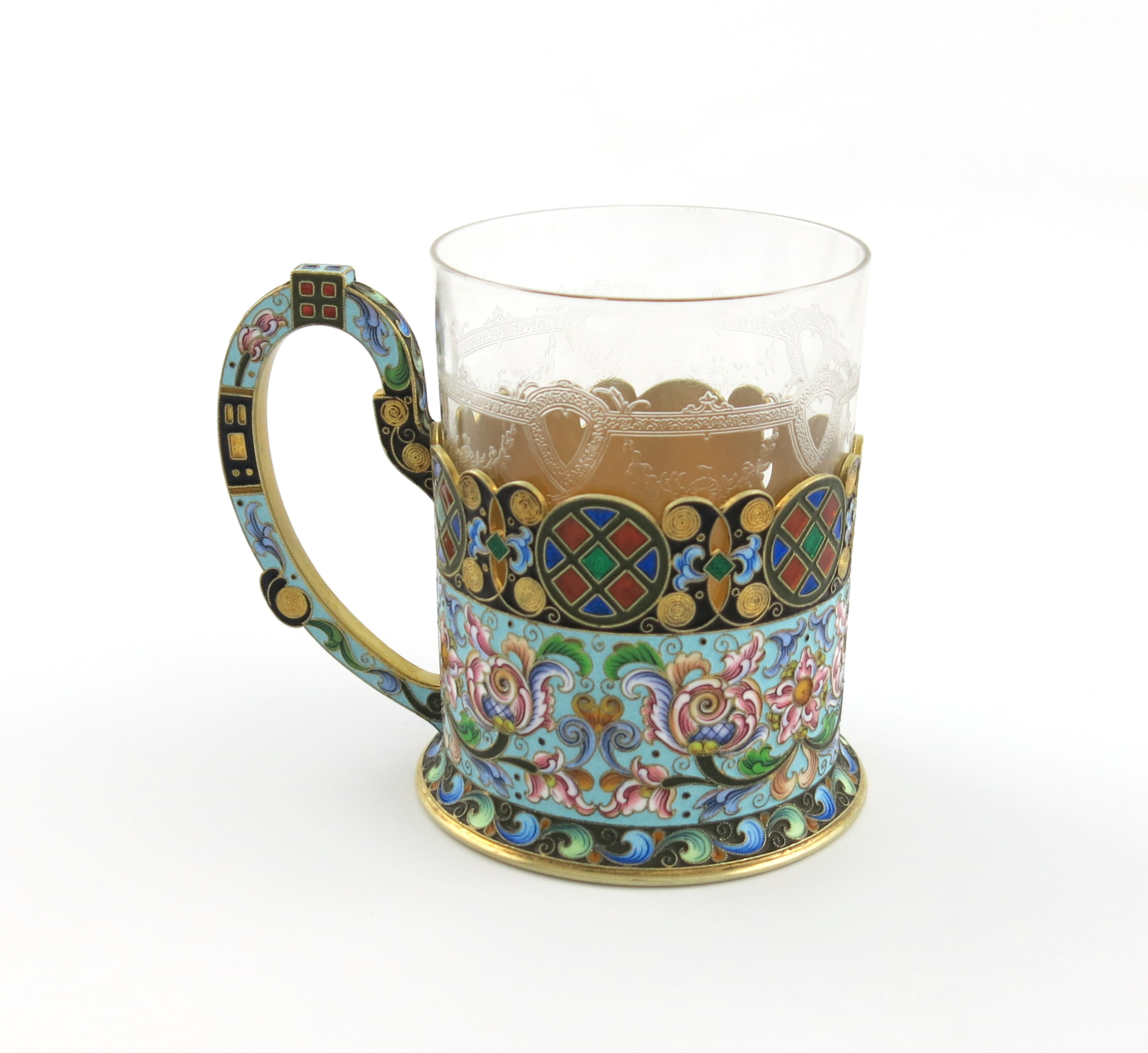 circular form, with vari-coloured foliate decoration, with a scroll border on a matted background, scroll handle, wavy-edge border, with an etched tea glass, height 9.6cm, approx. weight 5.9oz.