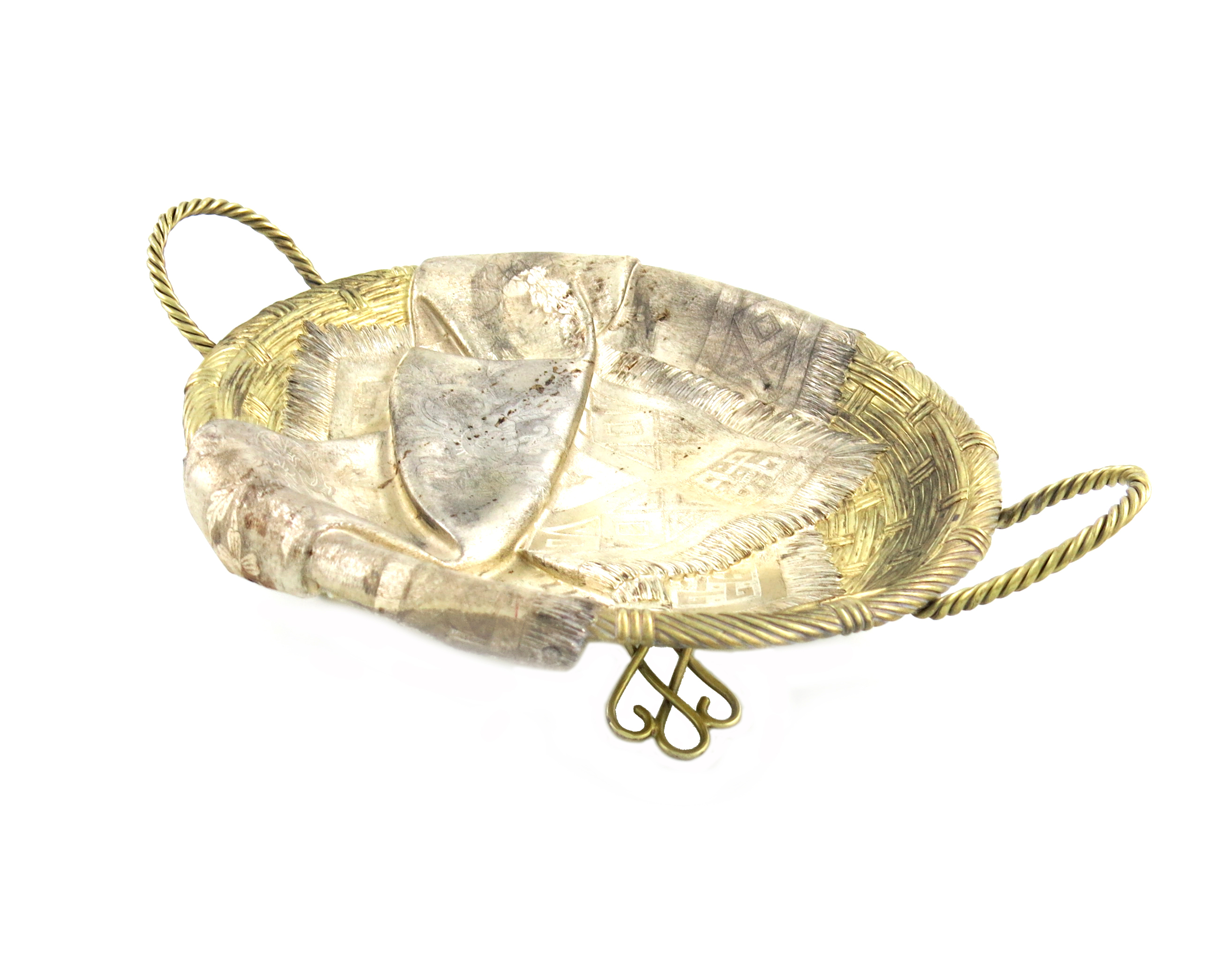 oval form, basket weave decoration, with a draped napkin, twisted basket weave handles, on four wire-work feet, length handle to handle 32cm, approx. weight 16oz.