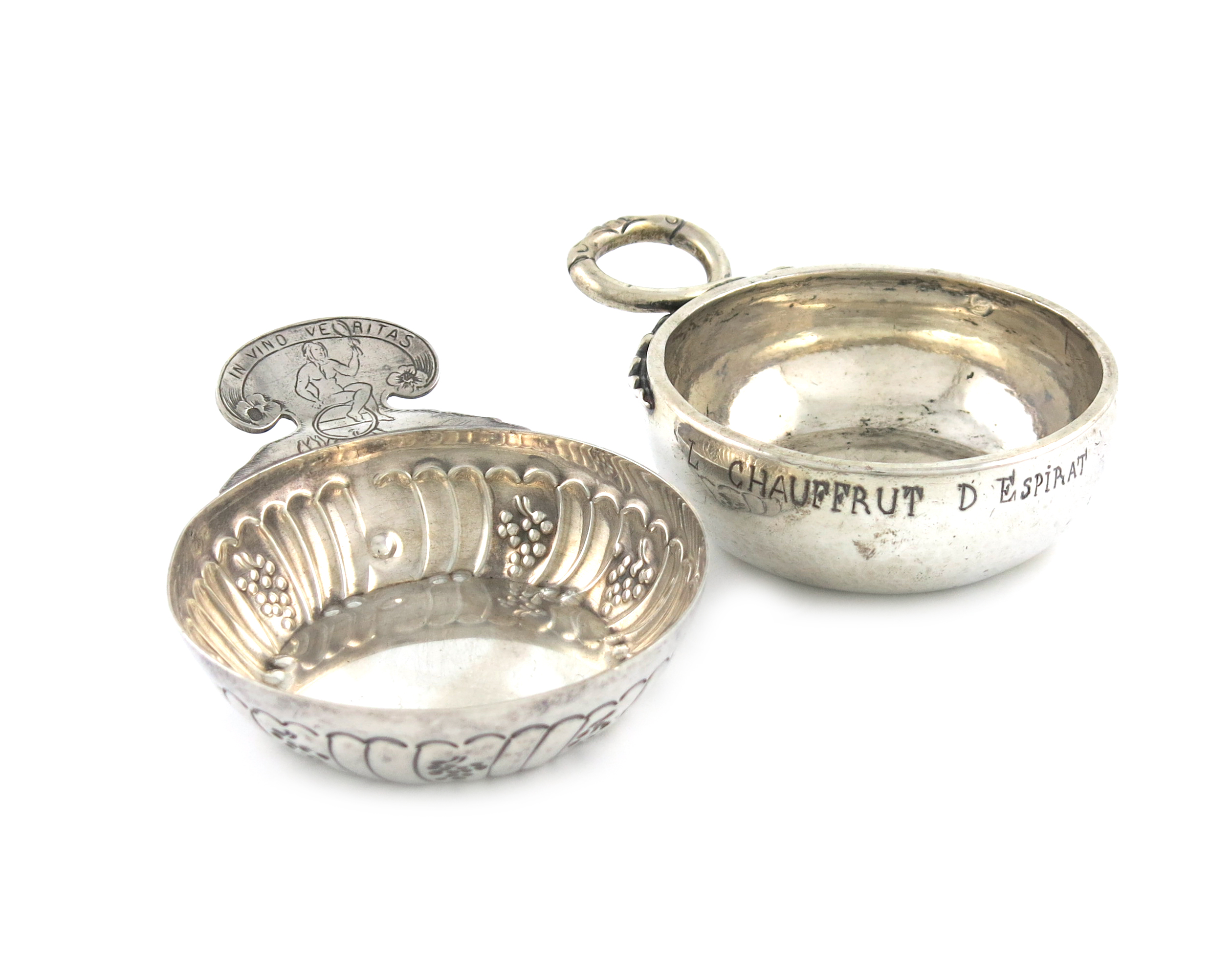 circular form, simulated double snake ring handle, inscribed 'L. Chauffrut D Espirat', length 10.8cm, plus another 19th century French silver wine taster, the handle engraved with a woman sitting on a barrel, inscribed 'In Vino Veritas', approx. total weight 5.4oz. (2)