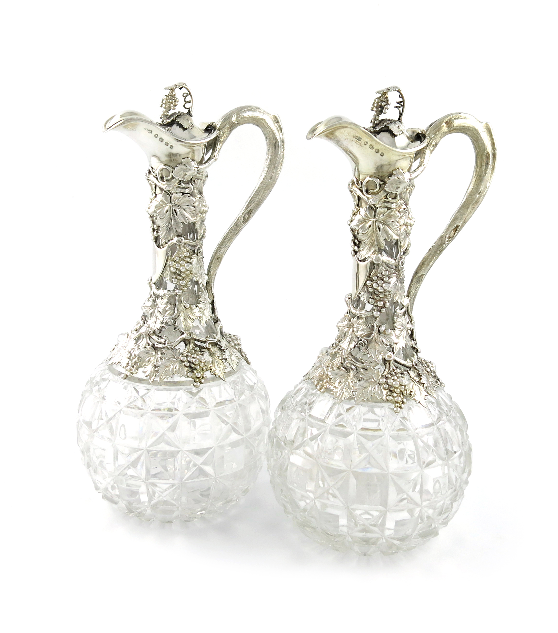 with traces of gilding, globular hob-nail cut body, the pierced mounts with trailing grapevines and with vacant shield cartouches, vine scroll handles, the hinged covers with grape finials, height 30cm. (2)