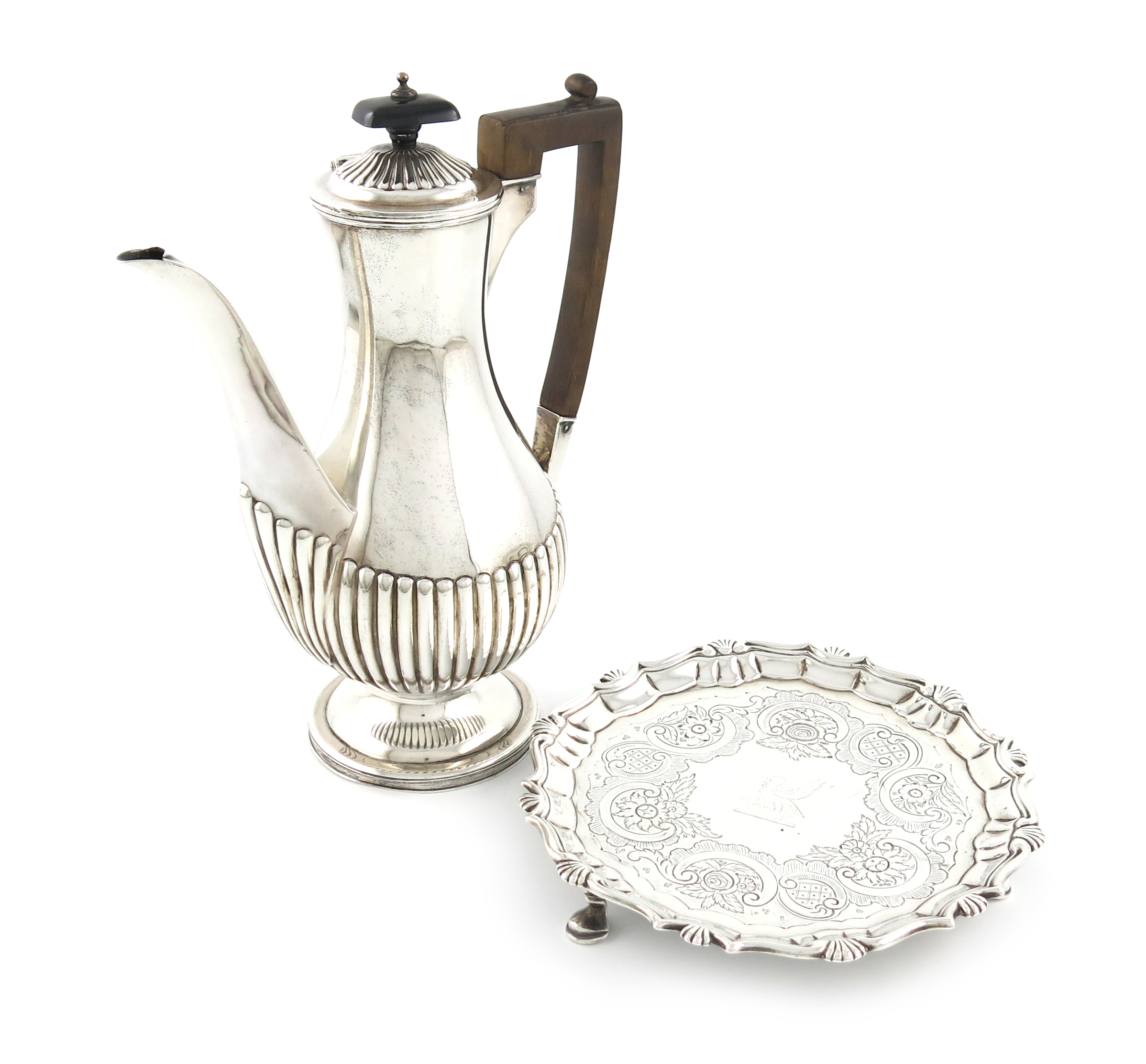 baluster form, part-fluted decoration, scroll handle, on a raised circular foot, height 24.5cm, plus a George II silver waiter, by William Kidney, London 1741, circular form, moulded shell and scroll border, chased decoration, the centre with a crest, on three hoof feet, diameter 18.5cm, approx. weight 31oz. (2)