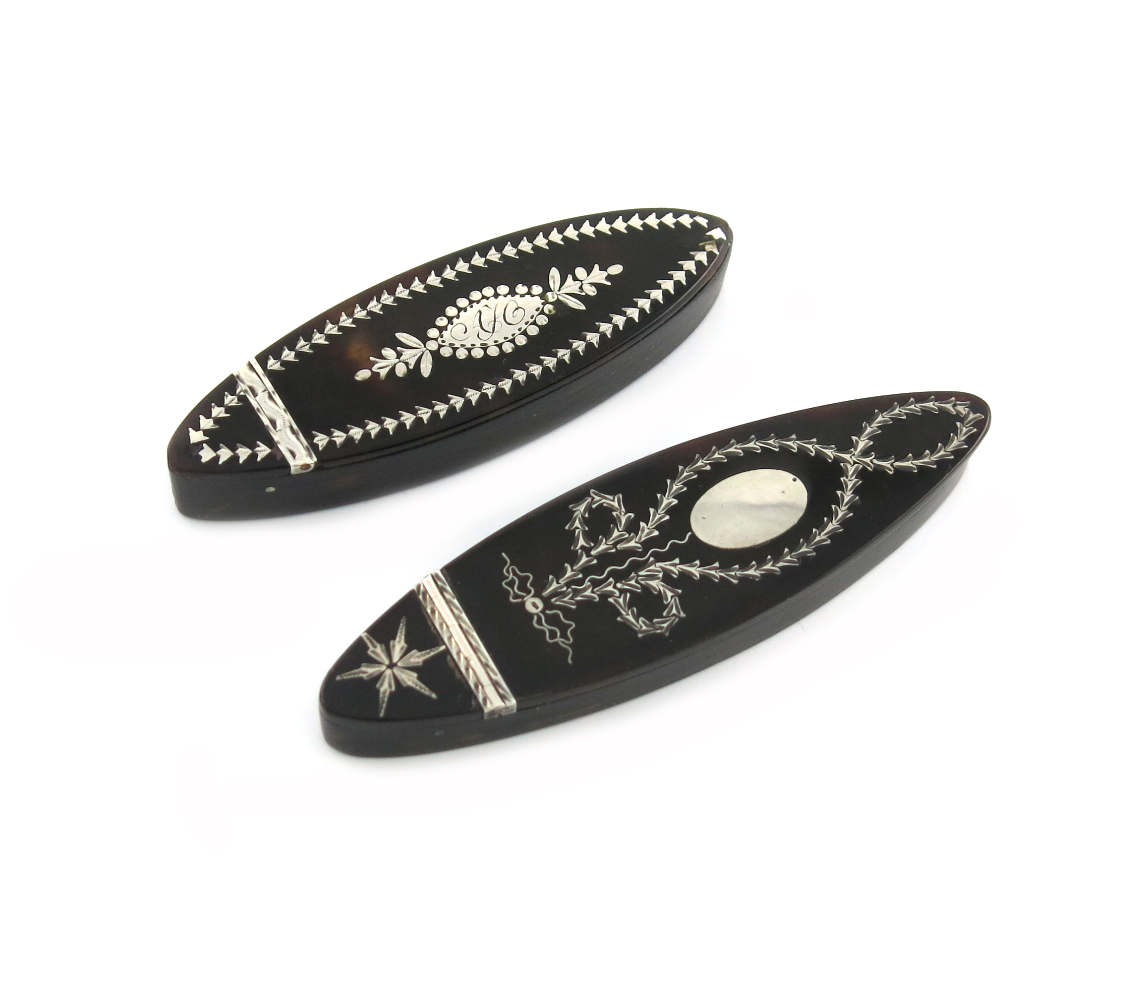 oval navette form, the hinged cover with inlaid decoration, and with an initialled oval cartouche, length 8.7cm, plus another George III silver mounted tortoiseshell toothpick box, unmarked circa 1790, oval navette form, the hinged cover with inlaid decoration, length 7.5cm, both with mirrors. (2)
