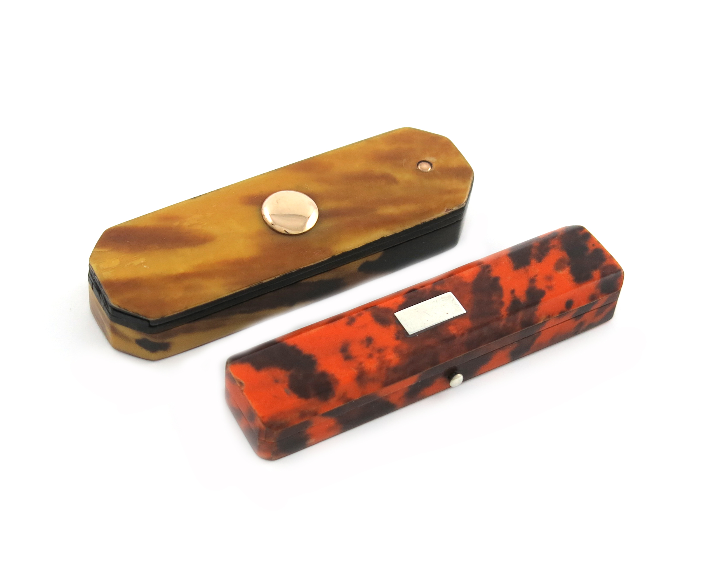 rectangular form, canted corners, the hinged cover with a plain circular gold cartouche, length 8.5cm, plus a George III tortoiseshell toothpick box, rectangular form, canted corners and bevelled cover, on an orange ground, the cover with a vacant silver cartouche, length 8.5cm. (2)