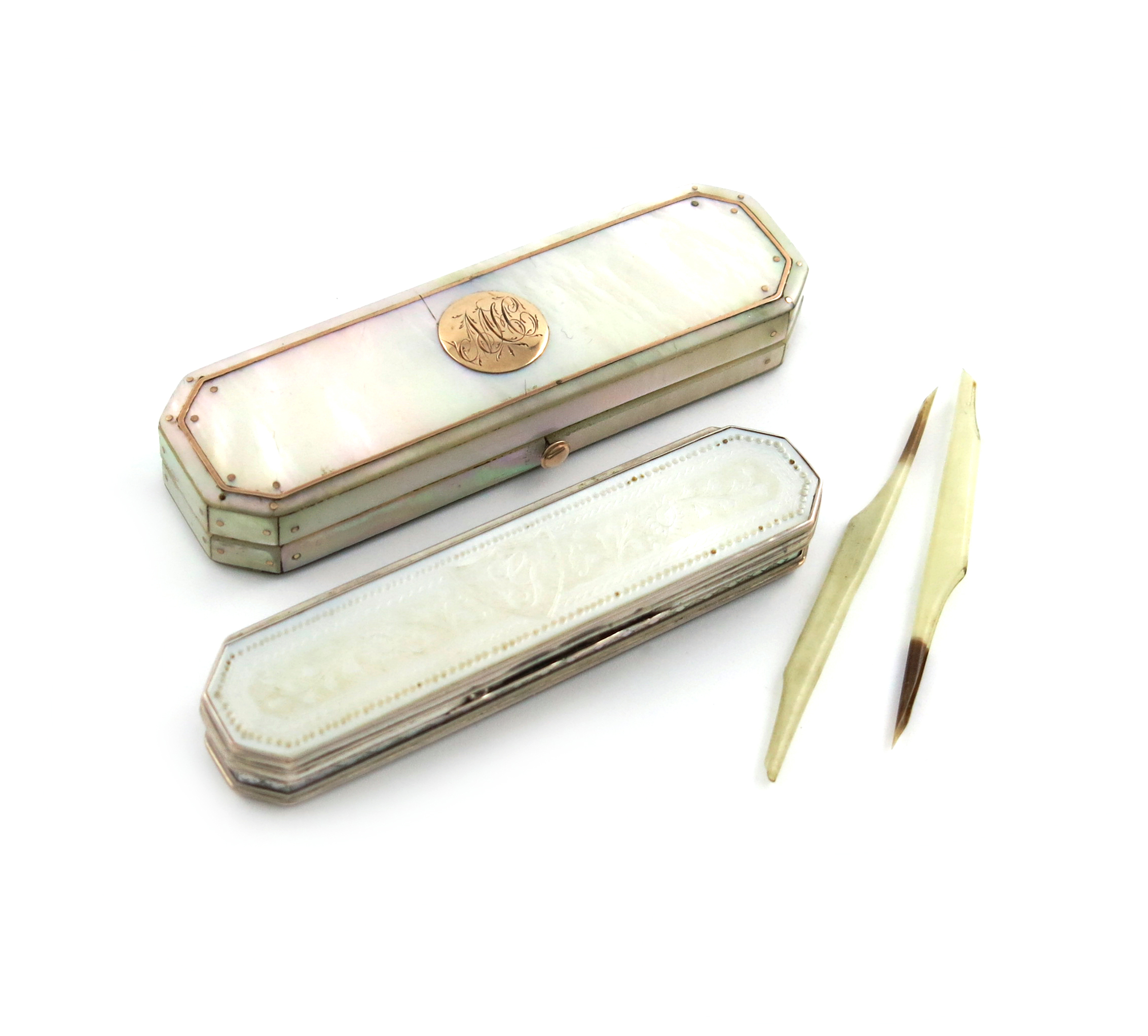 λA George III gold-mounted mother-of-pearl toothpick box,