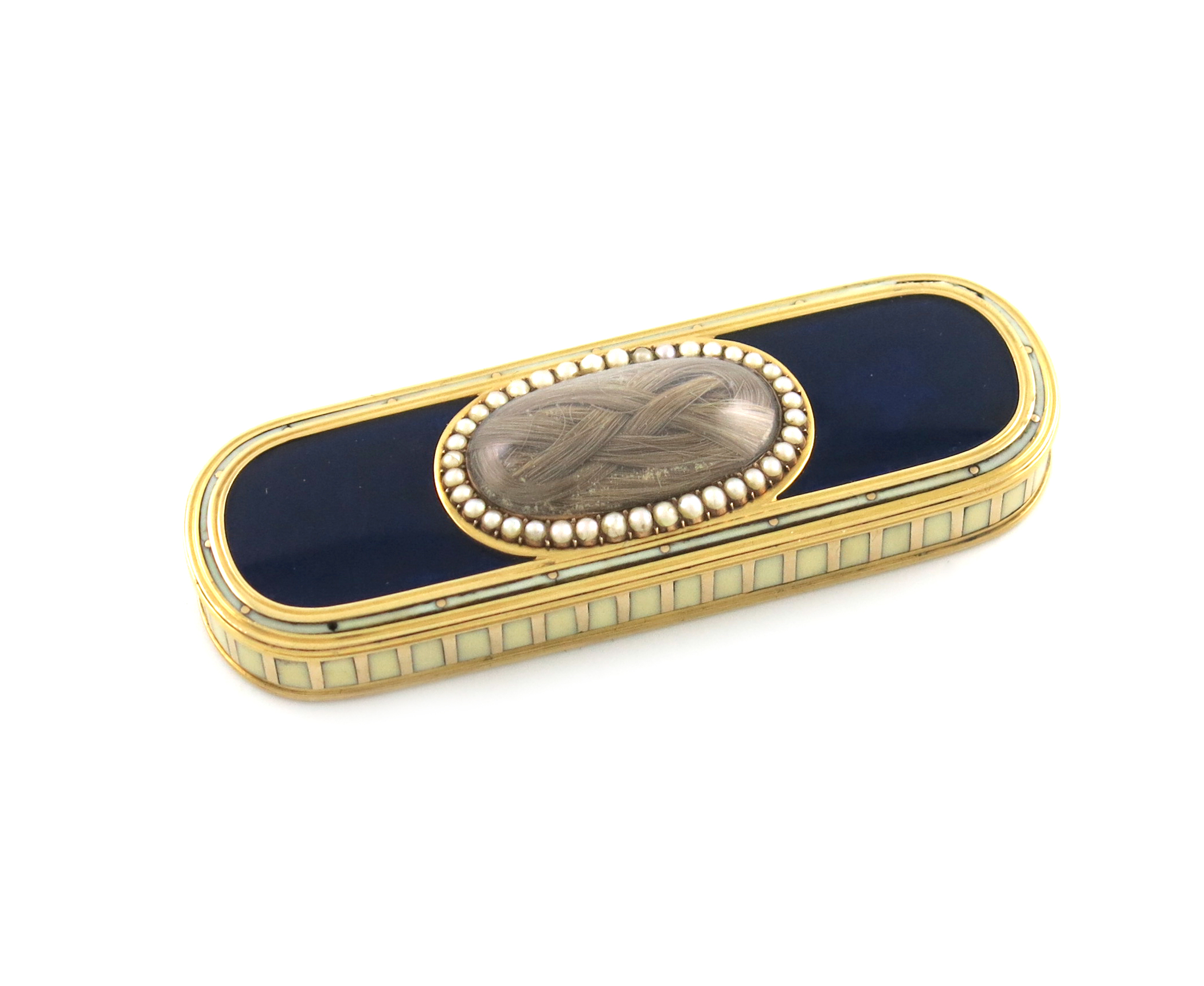 rounded rectangular form, the hinged cover with blue enamel, ivory banding and with an oblong cartouche of plaited hair under glass with a pearl border, ivory panelled sides and a blue enamel base with ivory stringing, the interior inscribed 'Mrs Holland, Daughter of Lancelot Brown, Grandmother of C.A Lady Fraser', the interior of the cover with a mirror, length 8.8cm, approx. weight total weight 76g.