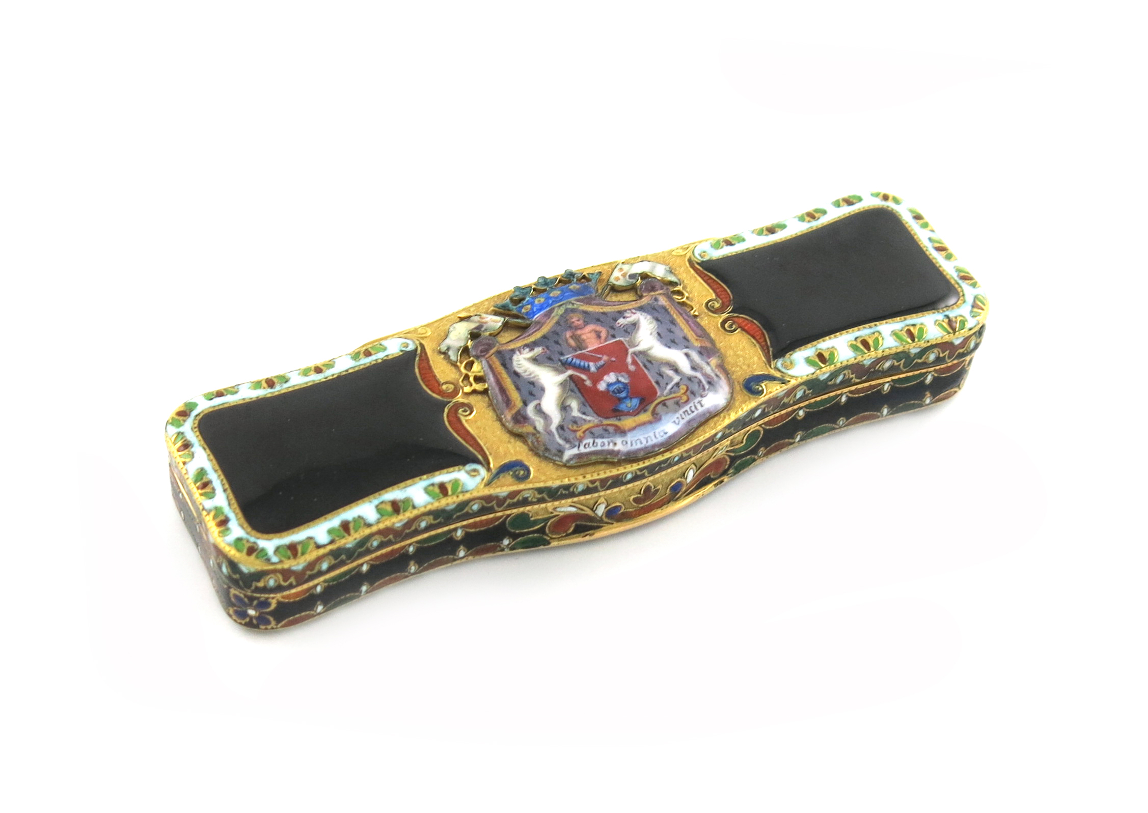 shaped rectangular form, the hinged cover with an enamelled armorial shield, the sides and base with enamelled decoration and initials, length 7.8cm, approx. weight 35.2g.