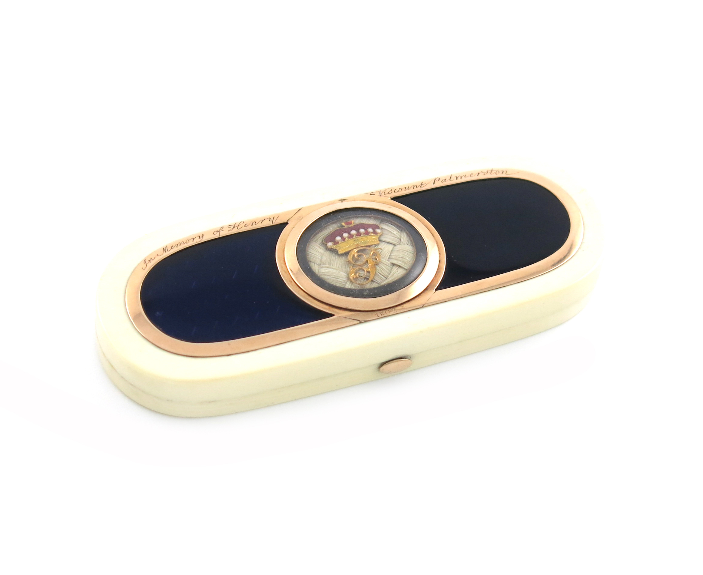 rounded rectangular form, the hinged cover with dark blue enamel decoration, plain gold stringing, and with a central cartouche of plaited hair with a gold and enamel crowned 'P', set under glass, inscribed 'In memory of Henry Viscount Palmerston 1802', the interior of the cover with a mirror, length 9.5cm.