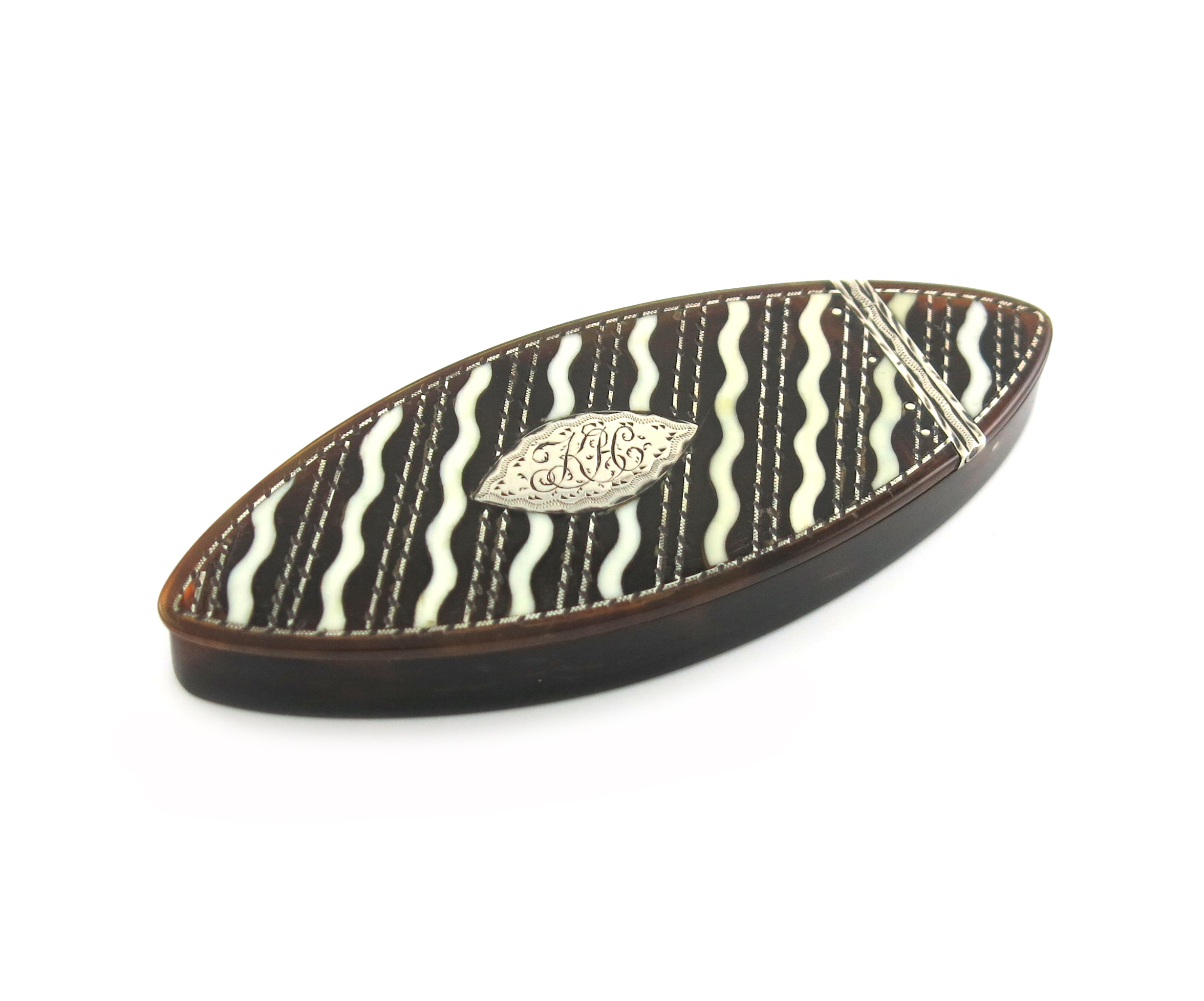 oval navette form, the hinged cover with inlaid wriggle-work ivory decoration and with silver stringing, with an initialled oval cartouche, the hinged cover opens to reveal a mirror, length 9cm.