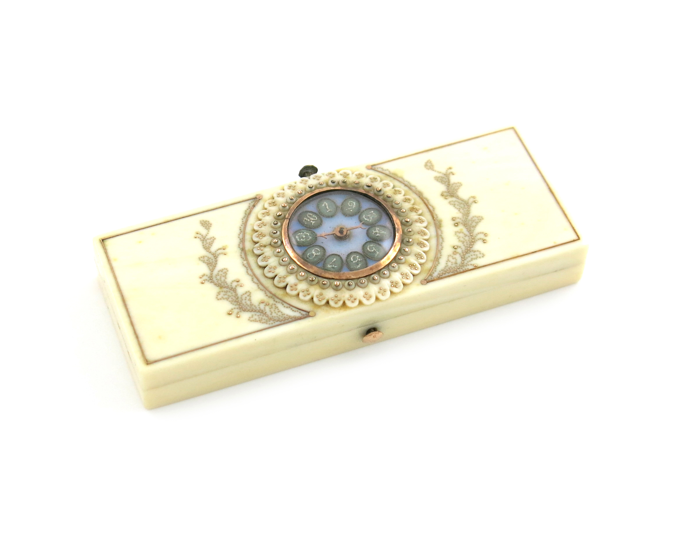 rectangular form, the hinged cover inlaid with gold stud work decoration, with a central circular whist marker, on an enamelled ground, set under glass, the interior with a mirror, the base with two compartments, length 8.4cm.